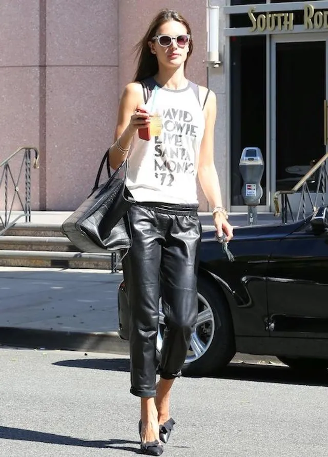 "Екс-ангел" білизняного бренду Victoria’s Secret теж у своєї гардеробі зберігає для виходів чорні шкіряні штани, які легко спадають на її бедрах та ногах. До них зірка підібрала футболкою з принтом, велику сумку і туфлі-човники такого ж відтінку.