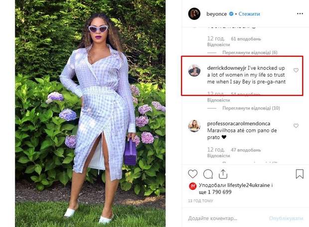 На фото Бейонсе позує у сукні на запах в біло-фіолетову клітинку. На одному з кадрів вона зімкнула руки на животі, а на іншому позувала прямо, повернувшись до камери. Однак уважні прихильники помітили кругленький живіт свого кумира. "Вона що вагітна?", "Бейонсе явно приховує свій кругленький живіт! Скоро в їхній родині з'явиться четвертий малюк", "Хто-небудь крім мене ще бачить цей кругленький живіт?" та інші подібні коментарі посипалися на адресу співачки.