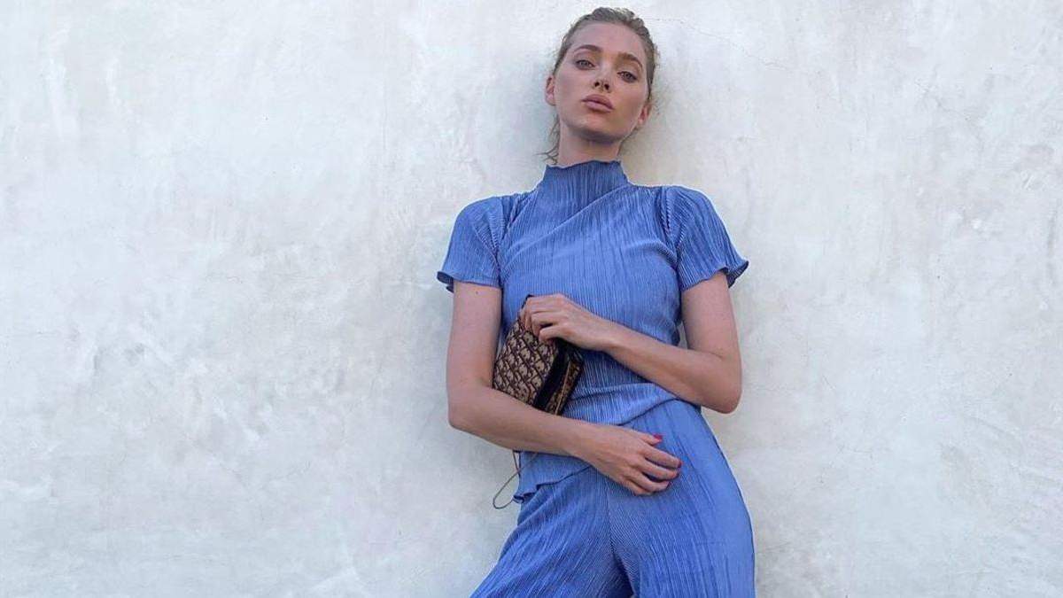 Модний образ Ельзи доповнювала невеличка біла сумка та блакитні мюлі. Волосся модель зібрала в акуратний пучок та завершила look ніжним та легким макіяжем.