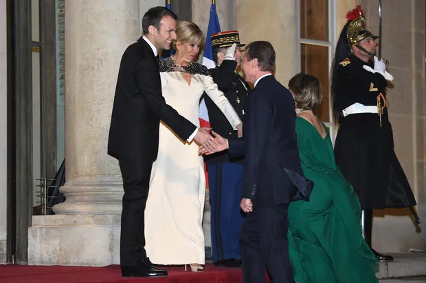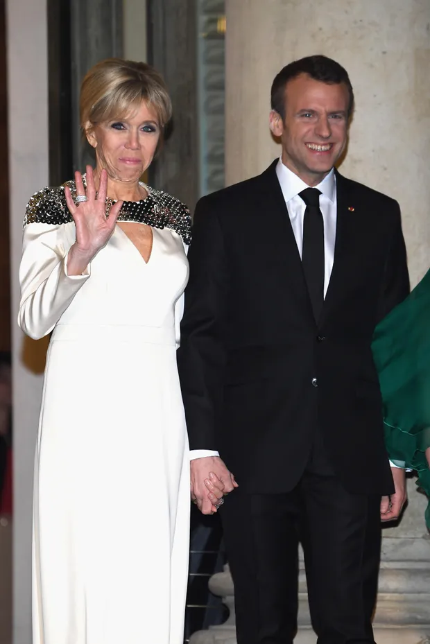За етикетом, учасники трапези обрали вечірні вбрання, що додало офіційному прийому елегантності та вишуканості. Так, Бріджит Макрон зачарувала гостей розкішною кремовою сукнею з шовку від бренду Louis Vuitton. Зверху плаття було розшите срібними паєтками та мало стильний виріз. Образ Бріджит Макрон доповнила бежевими туфлями на підборах, які мали металеві вставки.
