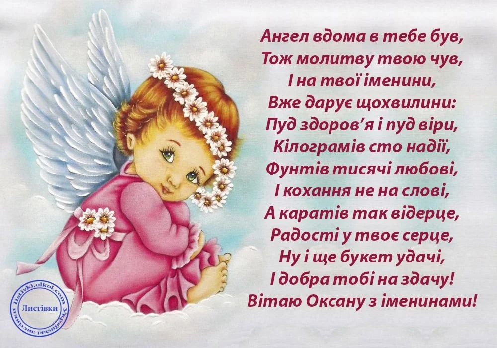 Оксано, бажаю, щоб твої дні були сповнені тепла, радості й світла. Нехай ангел завжди оберігає твоє серце, а поруч будуть лише надійні люди, які дарують підтримку і любов.