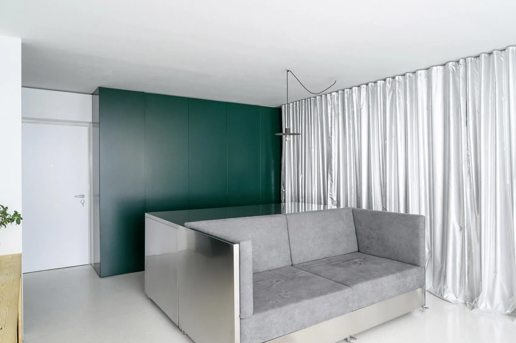Стильний диван металічного кольору легко перетворюється на стіл, а широкі вікна обрамлені довгими "металічними" шторами.