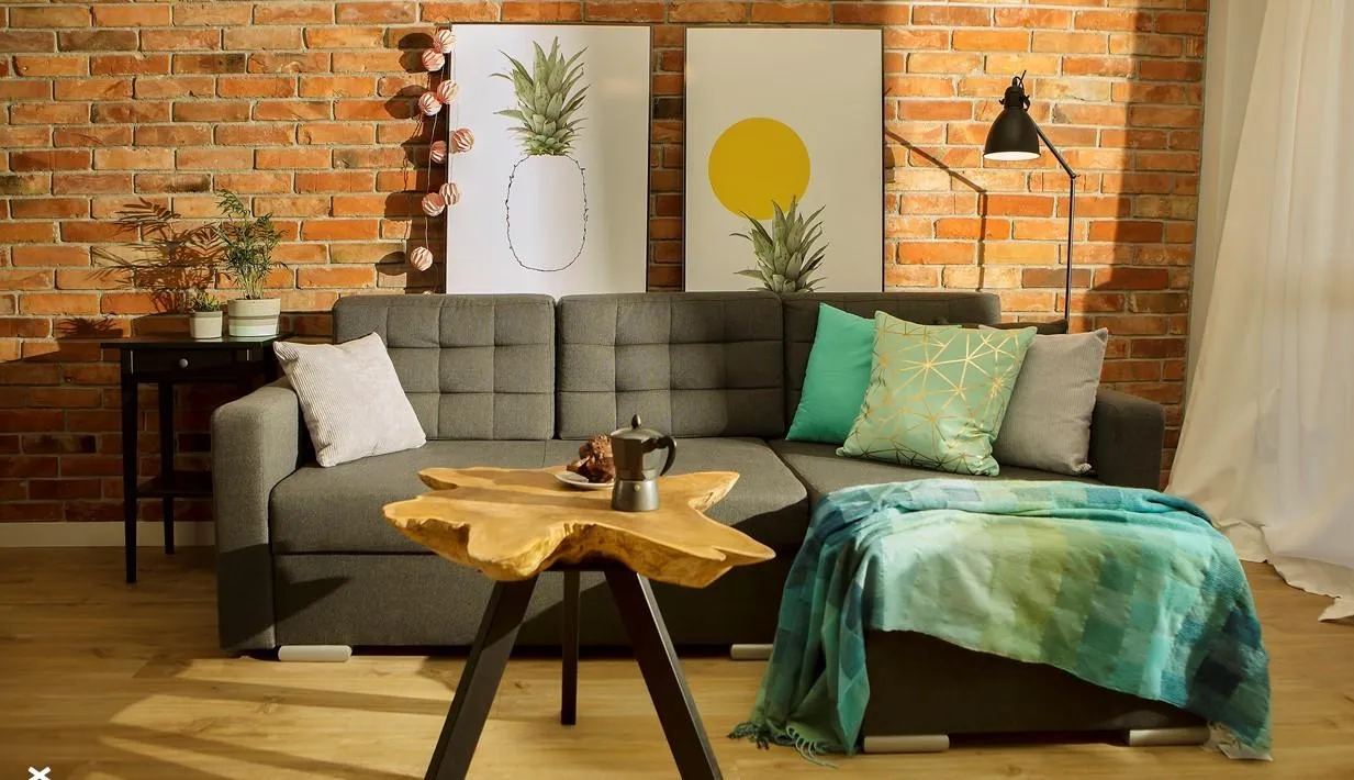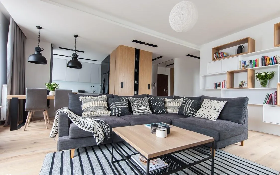 Окрім дизайну стін варто звернути увагу на темно-сірий диван, який не тільки виглядатиме стильно, але і буде дуже практичним. Більша частина бруду та плям буде зовсім непомітна. Якщо ви хочете отримати цікавий ефект, розбавте темний колір м’якими подушками яскравих або інтенсивних кольорів.