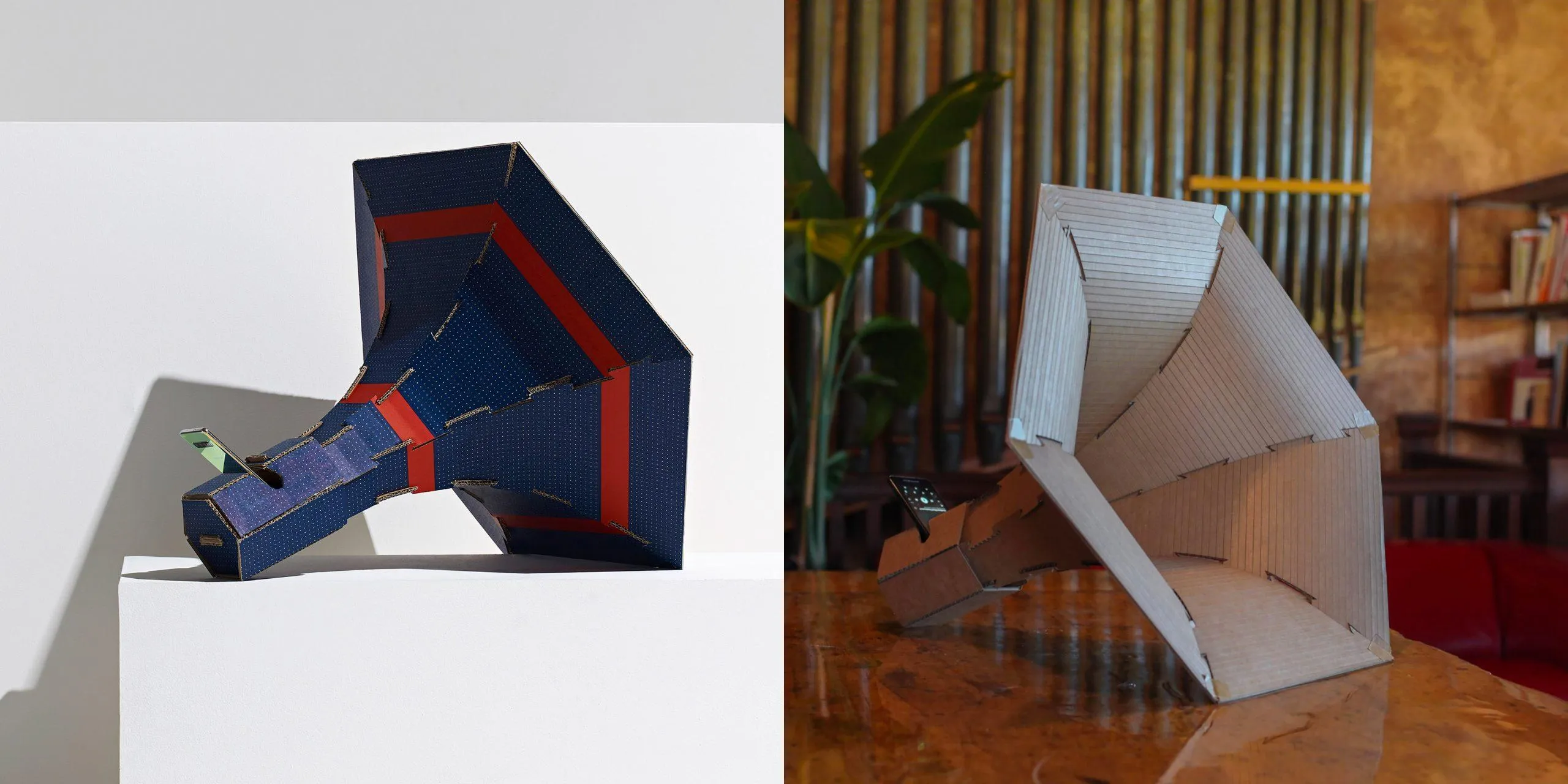 Дизайнерська студія створила картонний ріг, який підсилює музику з мобільного телефону. Конструкція побудована із серії плоских картонних панелей, та зовні нагадує грамофон.