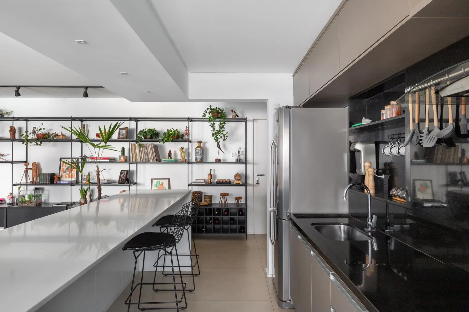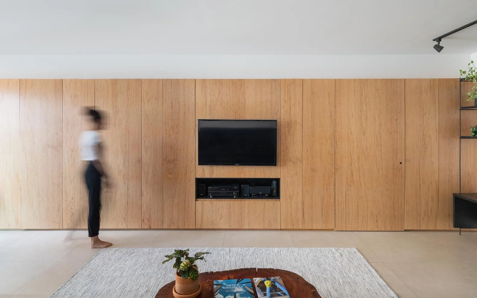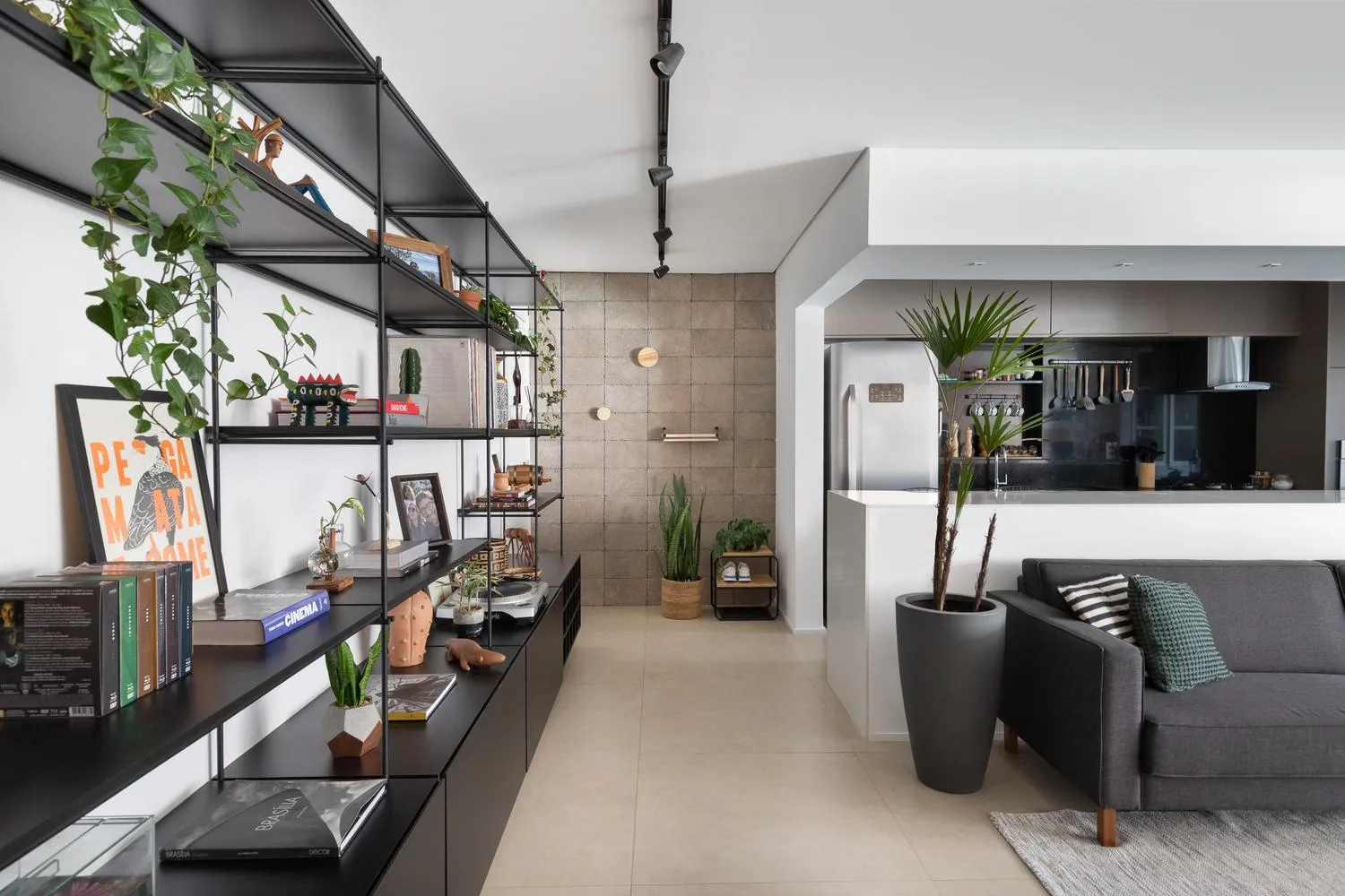 Також дизайнери оптимізували зберігання: на одній стіні закрита шафа, на іншій стороні поруч розмістили відкритий стелаж.