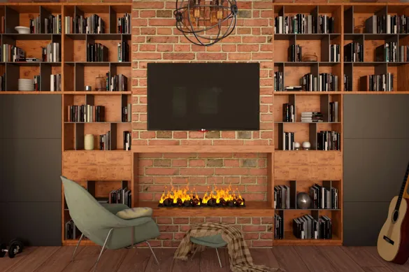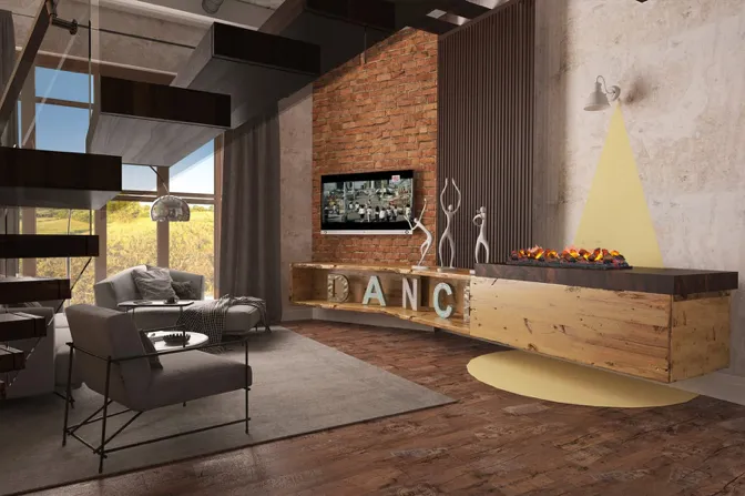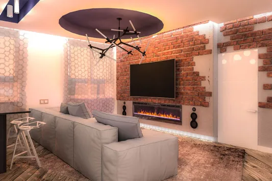 Урбаністика стилю Лофт акцентовано проглядається і в цьому інтер’єрі. Один з головних матеріалів в оздобленні даного стилю є цегла, зокрема червона цегла, з якої виконано імітацію зони відкритого вогнища. Ефект найреалістичного полум’я та ілюзію диму досягли за допомогою підлогового електрокаміну. Суть технології полягає в підсвічуванні випаровуючої пари, молекули води, відбиваючи світло, створюють переконливу ілюзію полум'я і диму, а ще зволожують вашу кімнату.