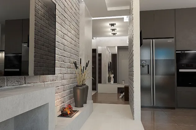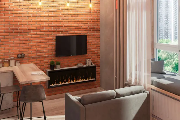 В інтер’єрі квартири-студії з маленькою площею набагато краще пристосується стиль Лофт. Високі стелі забезпечують більший простір для дизайнерського польоту фантазії. У цегляному будинку стіну можна залишити в первісному вигляді, лише трохи освітливши стики, щоб надати їй більш приємного вигляду. Коли до цегли дістатися складно через товстий шар штукатурки, можна просто наклеїти 3D-панелі під цеглу або ж використати плоску натуральну цеглу (як в даному інтер’єрі). Акцентом в цьому інтер’єрі є не тільки цегляна кладка, а й ідеальний декоративний елемент – електрокамін від DIMPLEX з приголомшливою футуристичною візуалізацією полум'я, але і завдяки функції обігріву може бути використаний в якості основного або додаткового джерела обігріву приміщення. Електрокамін безумовно стане центром вашого інтер'єру.