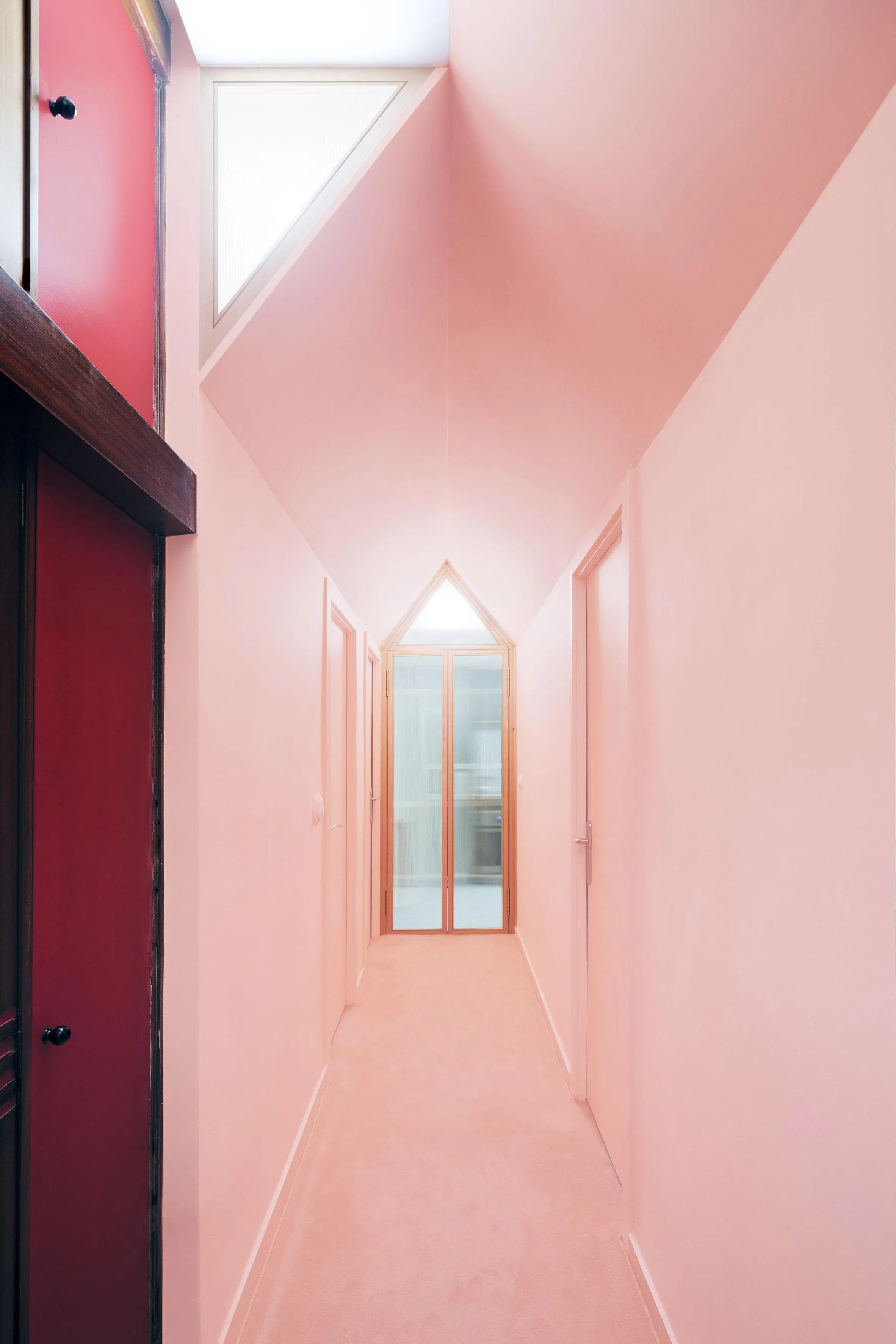 Рожевий, який ми використовували в цьому проєкті, був обраний завдяки його простоті та аурі винахідливості і оптимізму, що дуже необхідно в будинку з невеликою кількістю меблів,