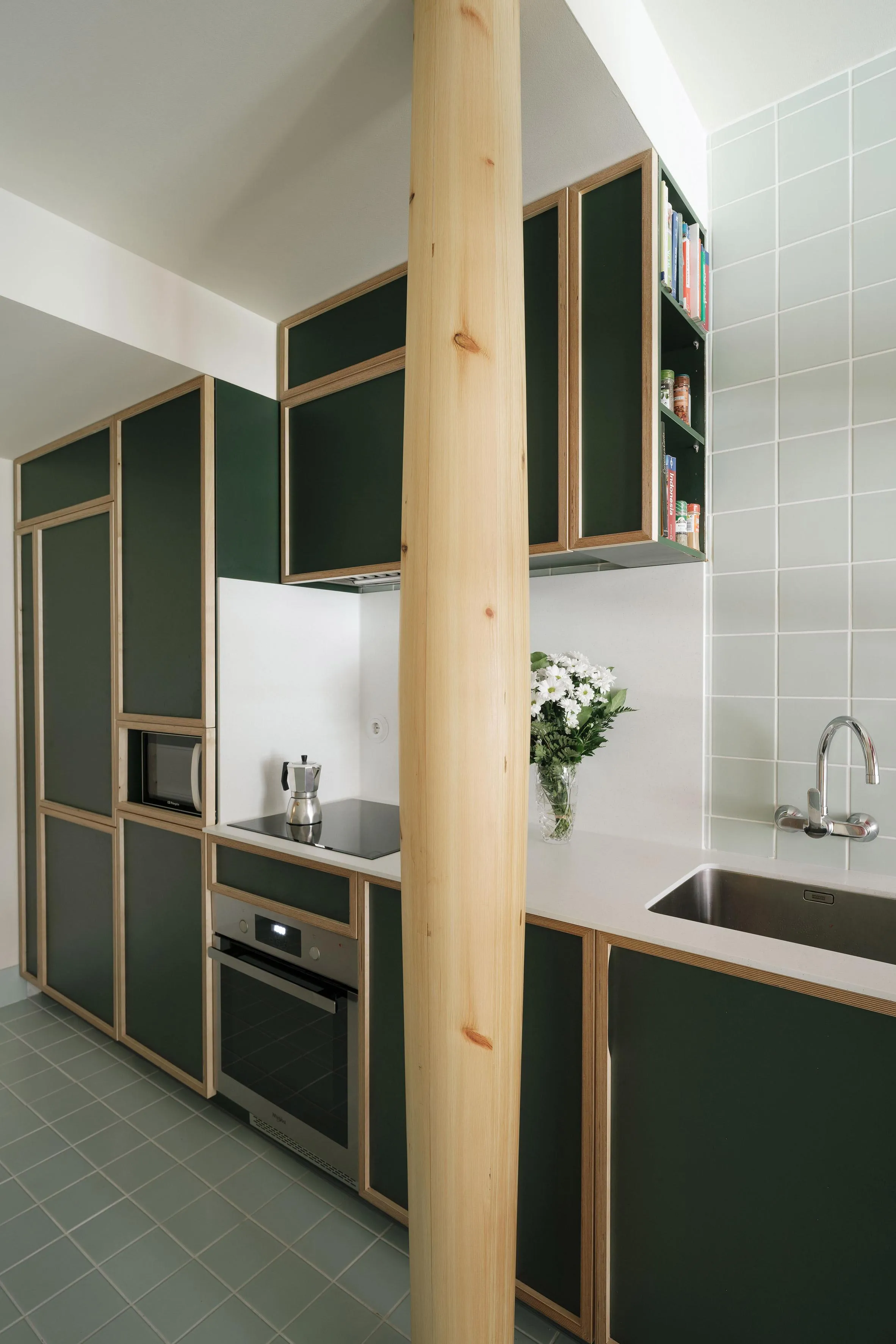 Зелений колір використали в дизайні меблів на кухні, а також підлогового покриття. Проте більшість елементів декору, залишилися у первинному стані.