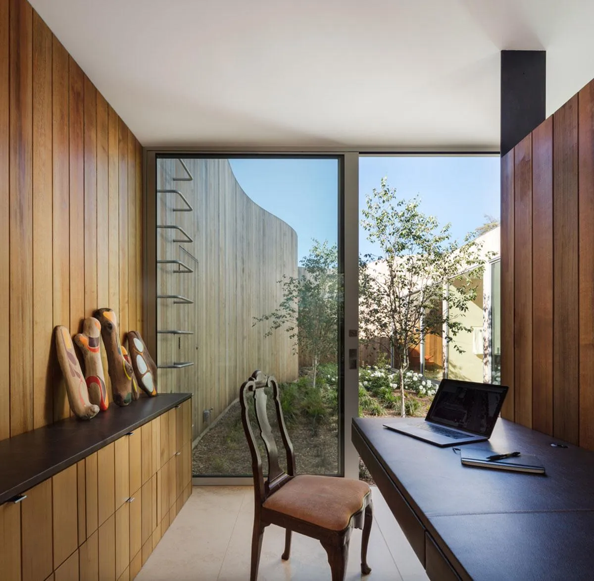 Особливим побажанням клієнтки стало облаштування якомога більшої кількості функціональних зон просто неба. Студія врахувала кліматичні параметри ділянки – помірний, майже середземноморський клімат Каліфорнії був би ідеальним для цього рішення, проте завдання ускладнилося параметрами ділянки. Довга та вузька територія, зі всіх боків оточена типовими заміськими будинками, не дозволила реалізувати цей план на повну.