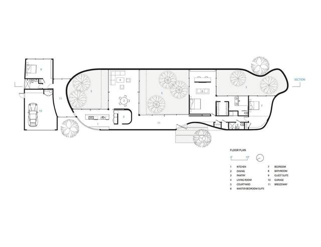 Архітектура будинку була спрямована на "стирання кордонів між внутрішнім і зовнішнім", що, за намірами проєктантів, повинно створити безперервний потік між лісом, внутрішнім двориком та самою резиденцією.