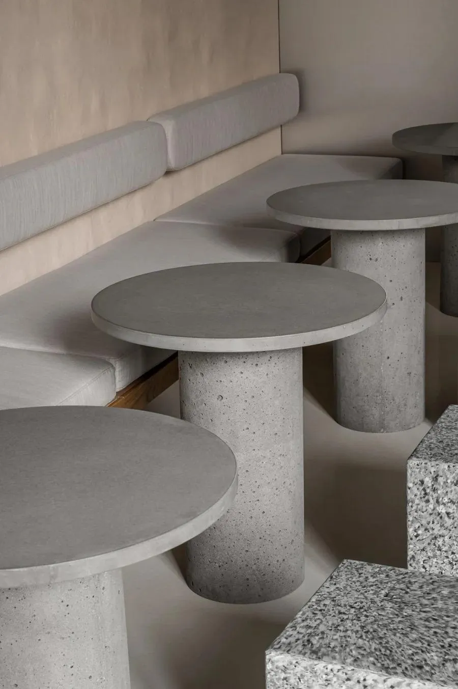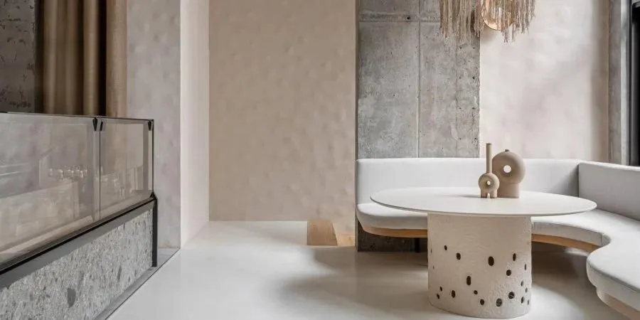 У київському ресторані “Їстетика” дизайнери використали грубий бетон, який контрастує з полірованим каменем і гладкою сталлю. Студія зосередилася на створенні чистих ліній та використанні натуральних або перероблених матеріалів. Проєкт розроблено з використанням традиційних українських технік.