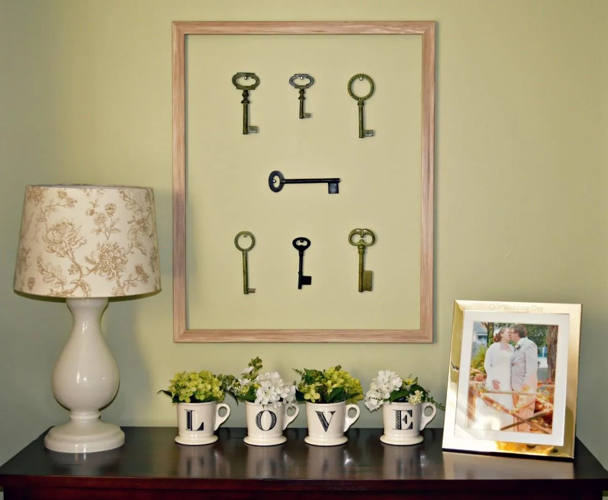 На барахолках можно найти много интересных вещей и дать им новую жизнь. Например, панно из ключей очень уместно смотрится во взаимодействии с деревянной мебелью.