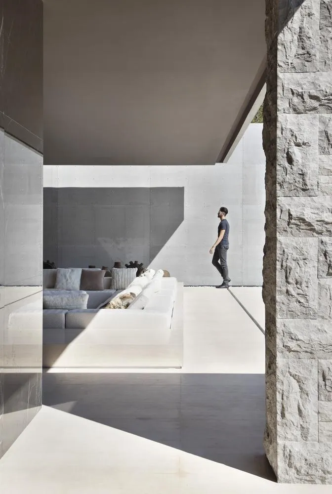 В студии предлагают диалог между искусственным – бетоном, который изготовлен человеком, и песком, который является природным элементом. В доме нет окон, однако выглядит он как большой балкон.