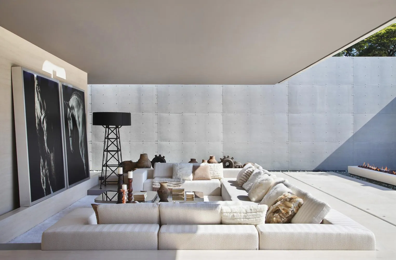 На крытой террасе есть искусственный камин и большой диван / Фото Archdaily