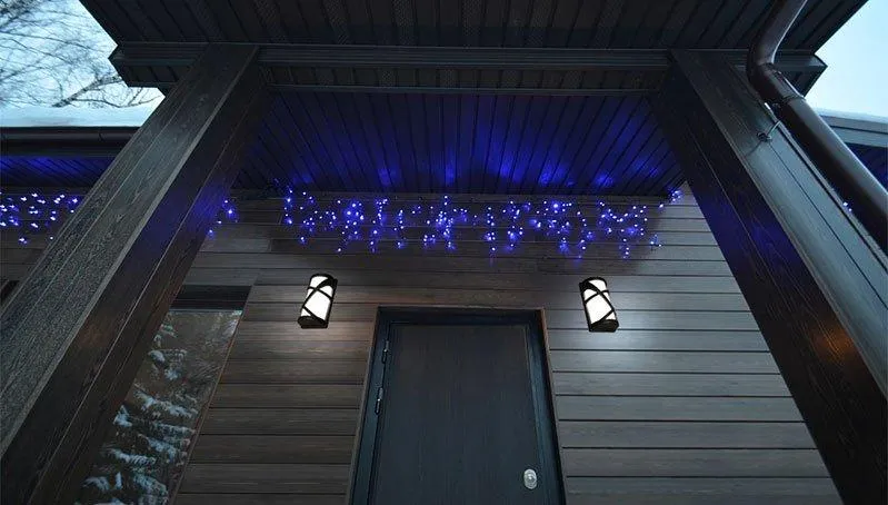 Контурное. Выполняется с помощью гирлянд или светодиодных лент. Размещаются по краям фасада, образуя "каркас". Хорошим решением будет встроить светодиодные ленты в элементы фасада. Таким образом они будут гармонично смотреться на частных домах.