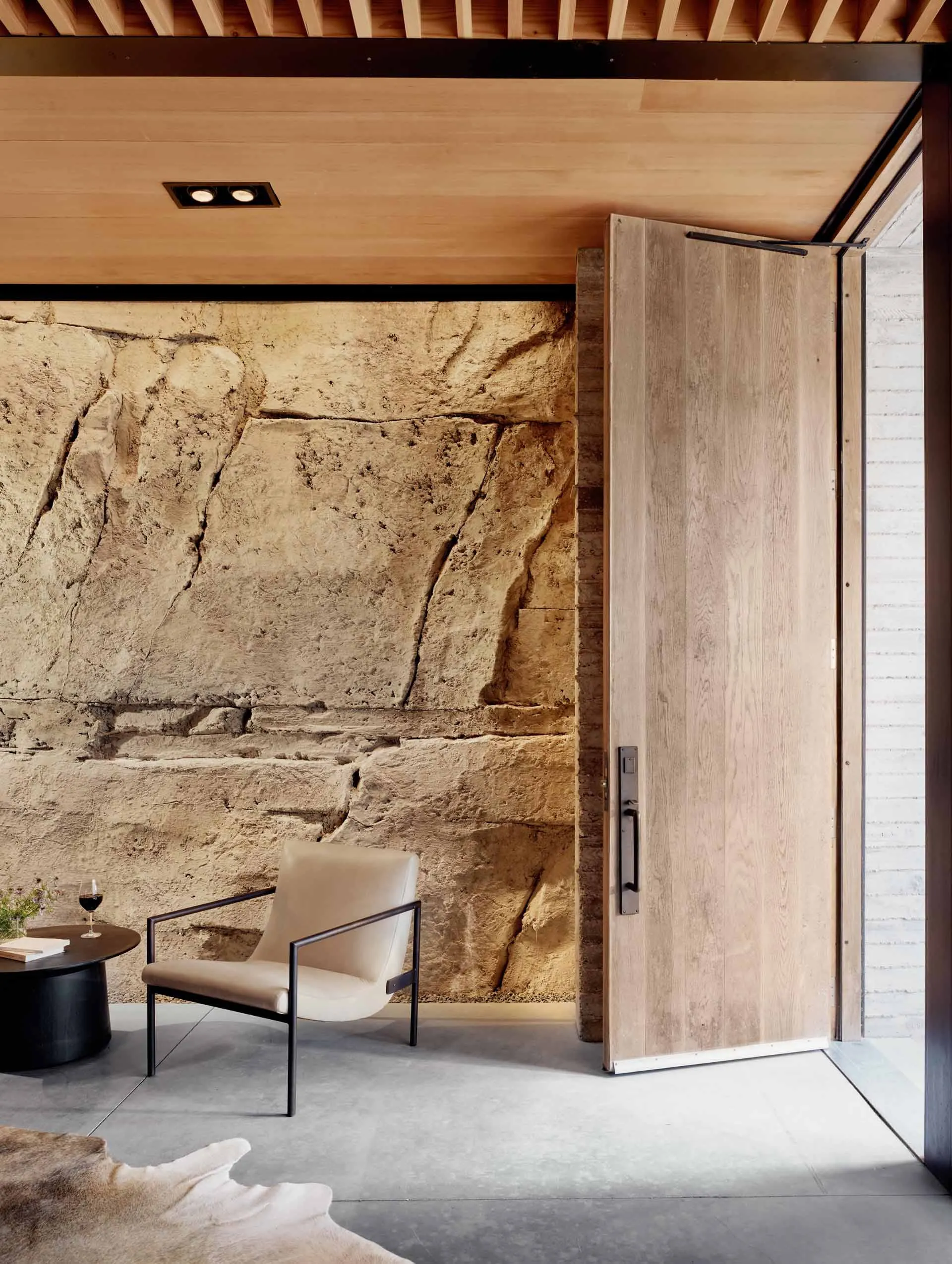 Деревянные двери, изготовленные на заказ, встречают посетителей, а внутри пространство покрыли белым дубом и натуральным камнем. Интерьер включает в себя дегустационный зал, бар, винный погреб, туалет.