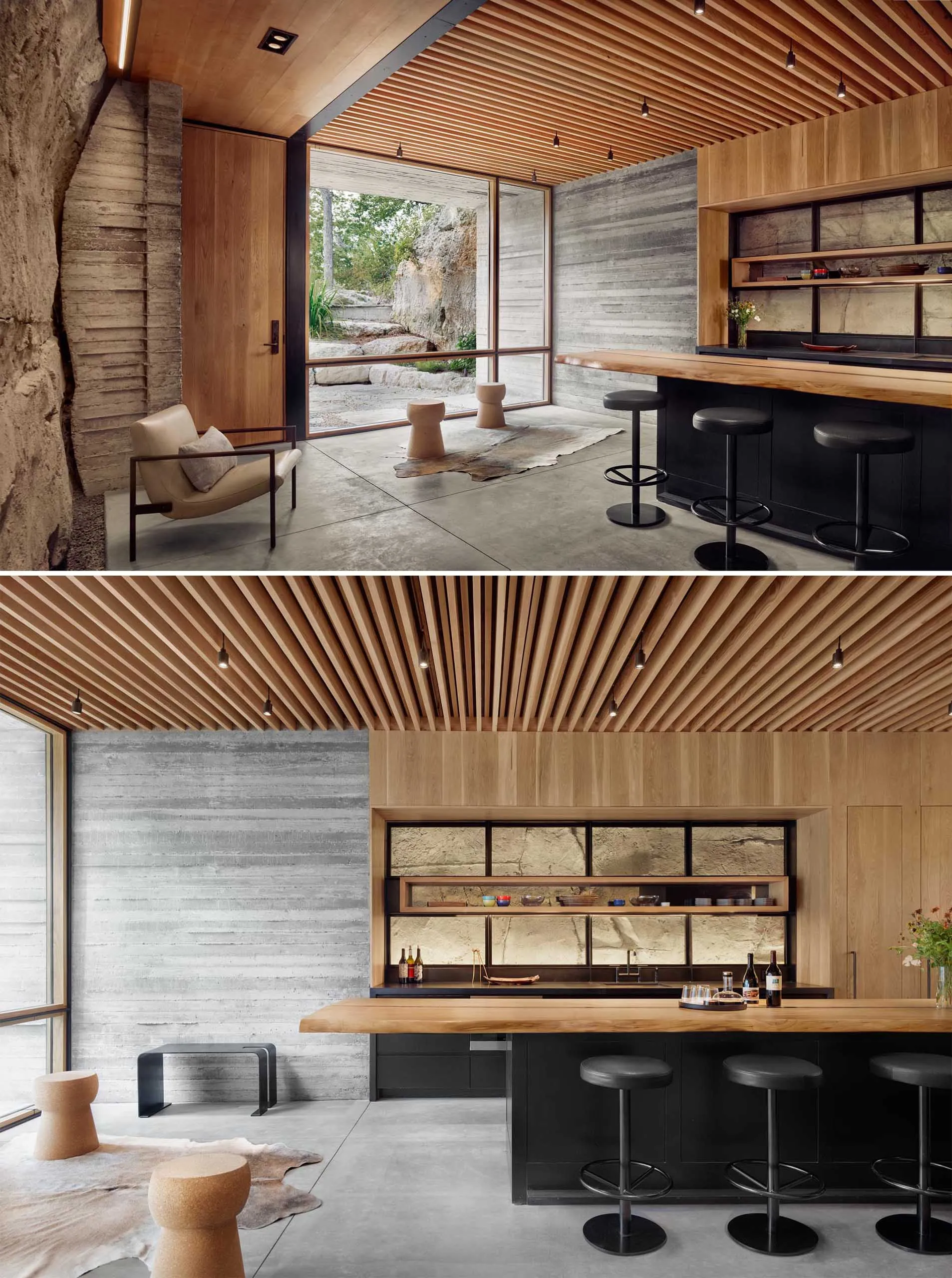 Рекультивируемый кедр был измельчен для отделки столешниц с живыми краями для дегустационного бара.