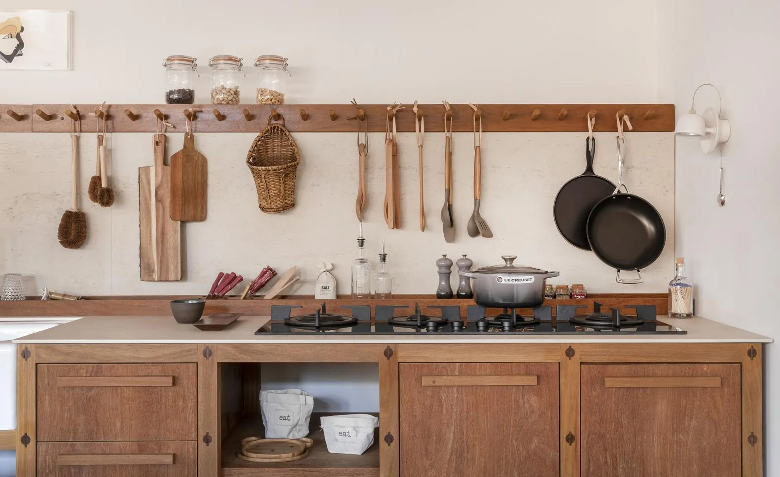 На кухне мы решили заменить полочки на крючки, которые в итоге демонстрируют волшебную посуду и все детали,