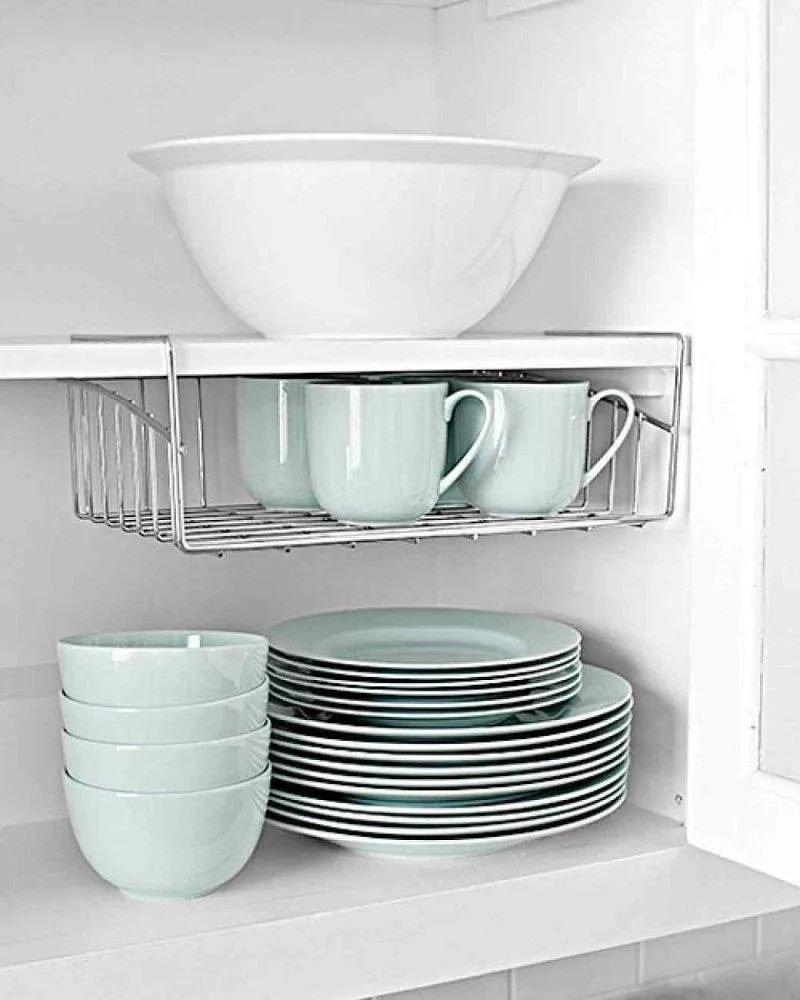 Чтобы увеличить полезную площадь в кухонных шкафчиках, хорошим вариантом будет размещение там металлических корзин.