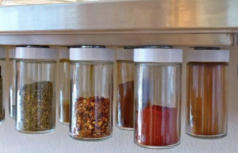 Чтобы специи всегда были под рукой, их можно разместить прямо под рядом верхних кухонных шкафчиков. Для этого нужно приклеить магниты к баночкам, а также к самой мебели.