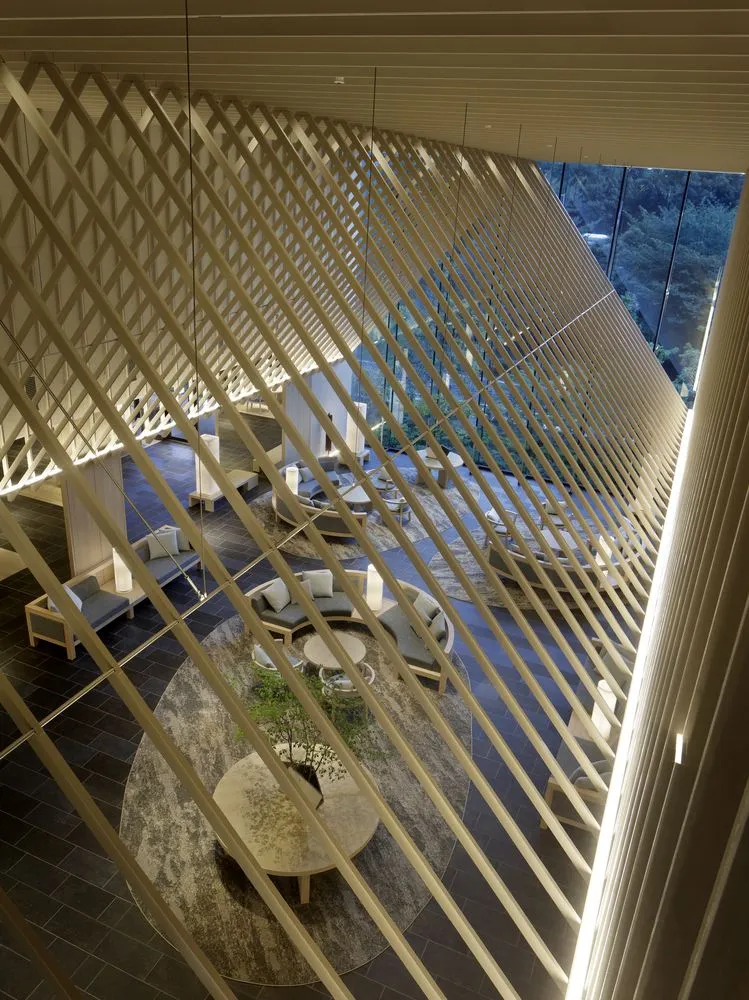 Атмосфера вестибюля резко меняется на рассвете или после захода солнца, ведь из-за разного освещения в разное время суток вместе с жалюзи создается игра света и теней.