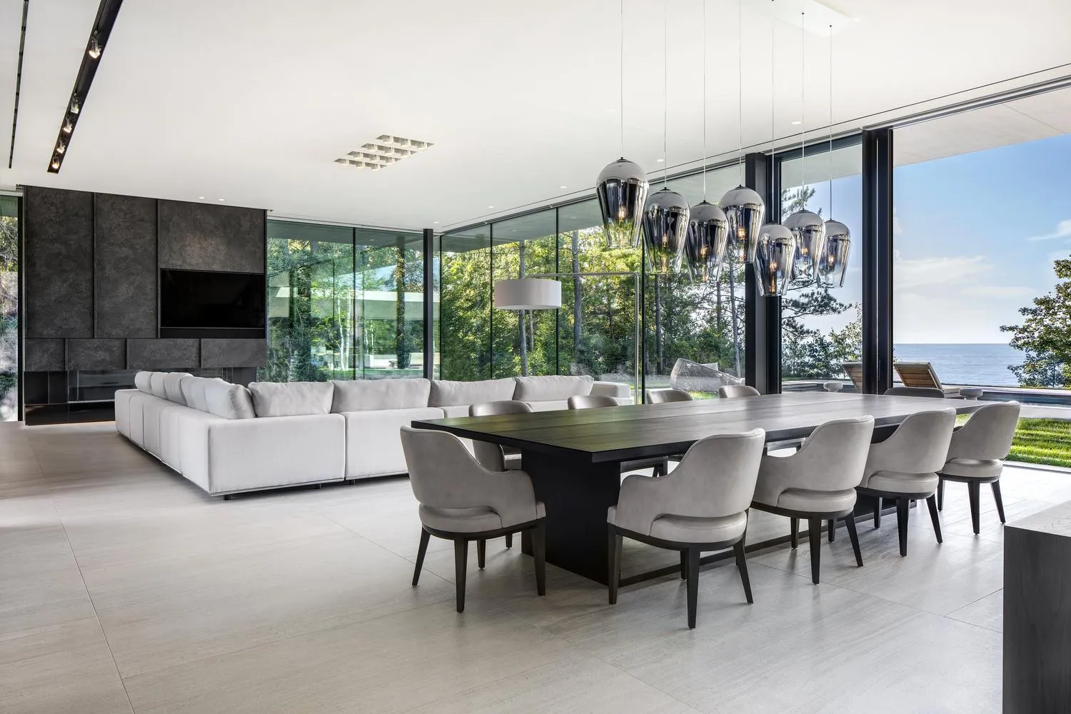 Задняя часть дома здесь обращена к озеру Гурон. Она полностью сделана из стекла, с помощью которого естественный свет врезается глубоко в интерьер, пишет Archdaily.