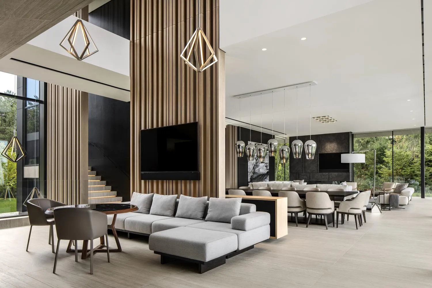 В интерьере выделяется освещение. В каждой зоне подвесные люстры имеют свой неповторимый дизайн.