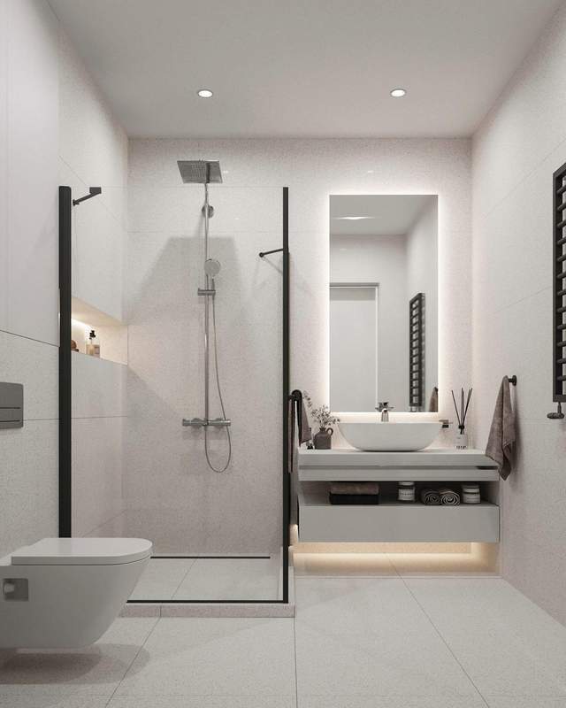 Атмосферное освещения коридора сразу настраивает на уют и комфорт, который будет сопровождать посетителей во всех комнатах апартаментов. Подсветка подчеркивает стену с ребристой текстурой, скрытой за зеркалом модной формы. В настенный шкаф аккуратно помещается стильный пуф. Элегантные черные крючки для верхней одежды крепятся к серой гранитной плитки.