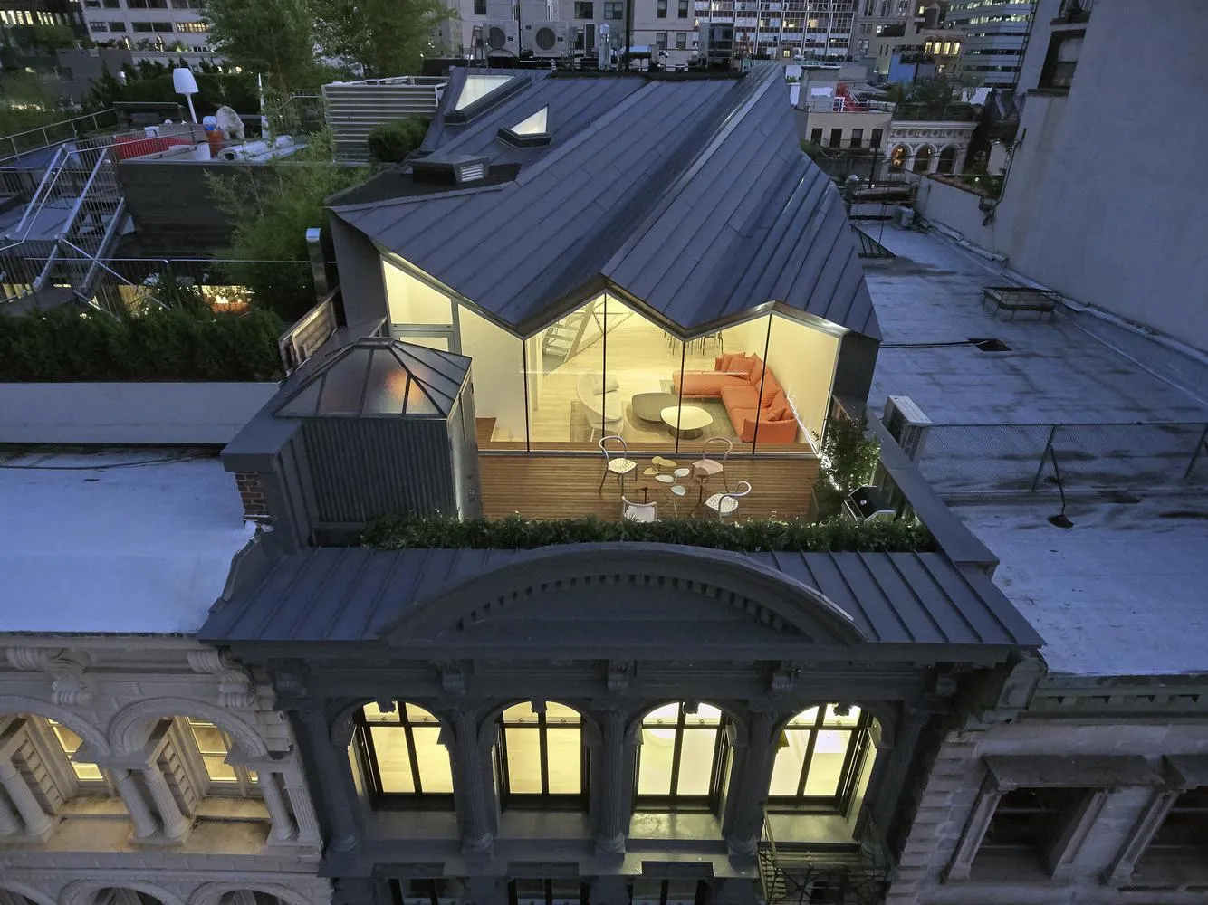 Этот проект вырастает прямо над тяжелой чугунной крышей исторического здания в центре Нью-Йорка. Архитекторы старались не повредить элементов фасада здания. Небольшие апартаменты получили прозрачные стены и просторную террасу.