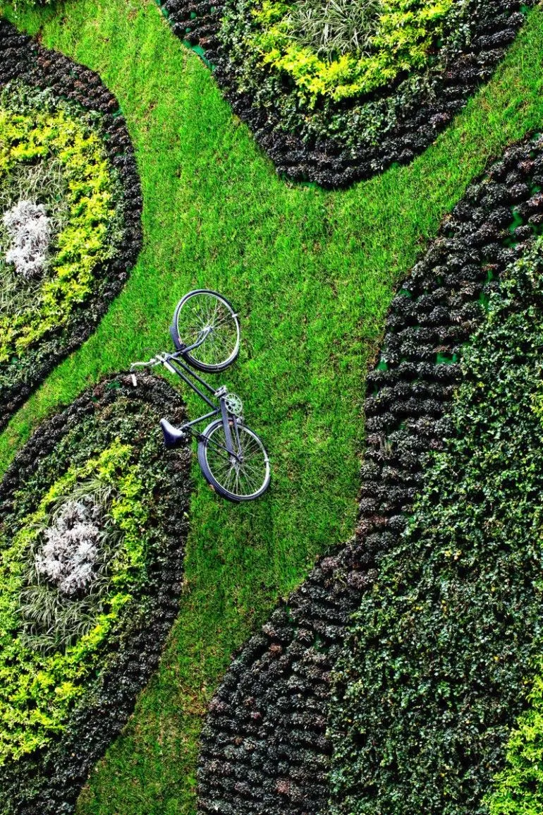 Заказчики проекта хотели сделать его запоминающимся надолго. Поэтому здесь есть не только зеленые растения, но и велосипед, который также закреплен вертикально.
