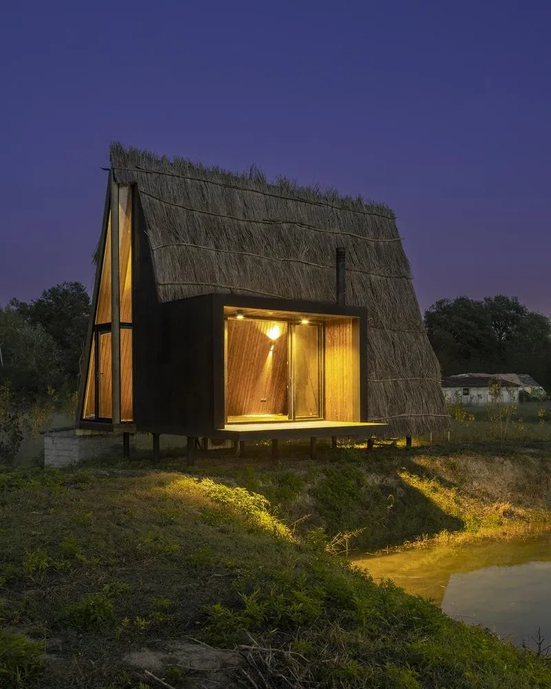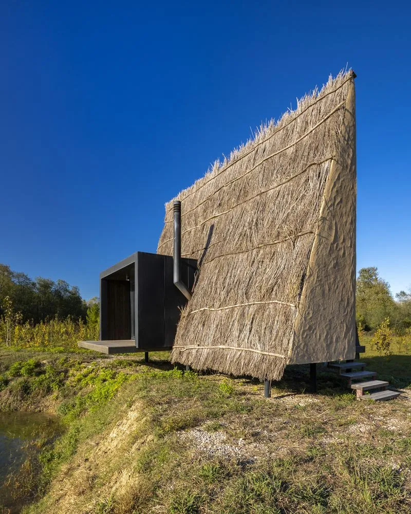 Для кровли выбрали солому и глина, чтобы окончательно выразить самобытность этого места. Длинная двускатная крыша была создана в форме каюты, чтобы быть приближенной к типологии сельского жилья.