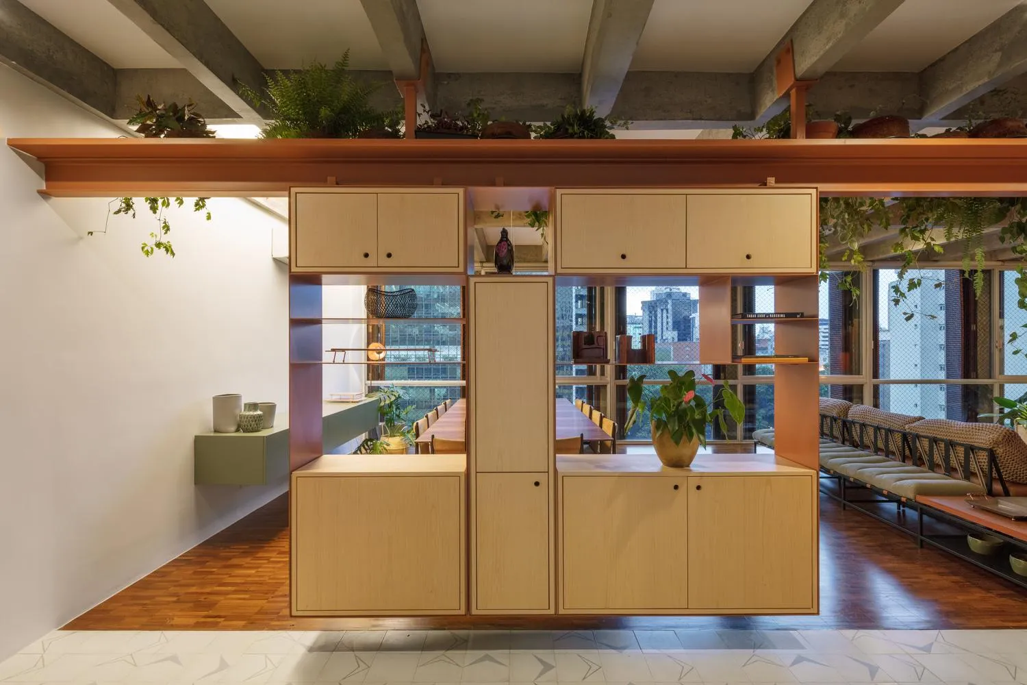 Стінка з'єднує всю квартиру вздовж і просторово визначає "лінію екватора" між різними кімнатами, та яку можна пересувати. Такий прийом виявився доволі зручним, адже полиці відіграють різну роль у різних кімнатах. Так, у коридорі, їдальні та вітальні, шафи зберігають посуд, демонструють мистецтво та підтримують рослини, а у вітальні – книги та електроніку.