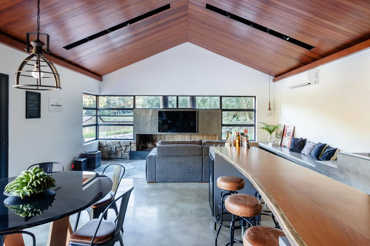 Тут власники використали полірований бетон у будинку в індустріальному стилі. Освітлення та електрика були виконані в оцинкованих трубопроводах та жолобах. Стіни були облущені спеціально, щоб залишити цеглу голою.