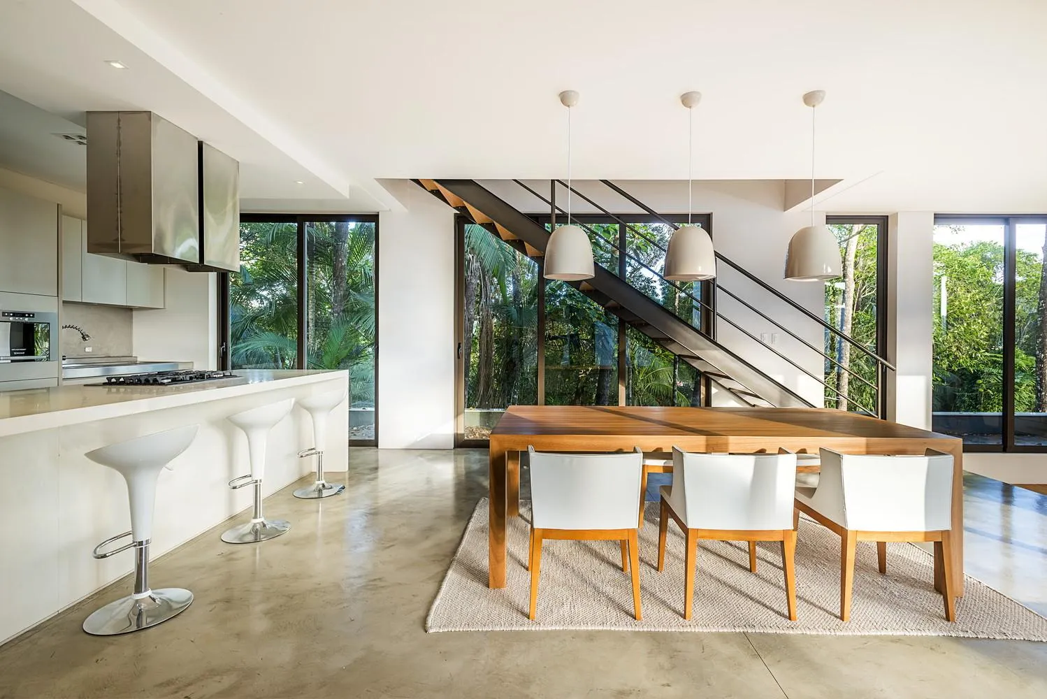 Строгі лінії та відсутність декору є головними особливостями цього будинку. Дизайнери використовували невелику кількість кольорів, які б разом утворили світлий та приємний простір. Логічним доповненням до білих стін тут стала бетонна сіра підлога.