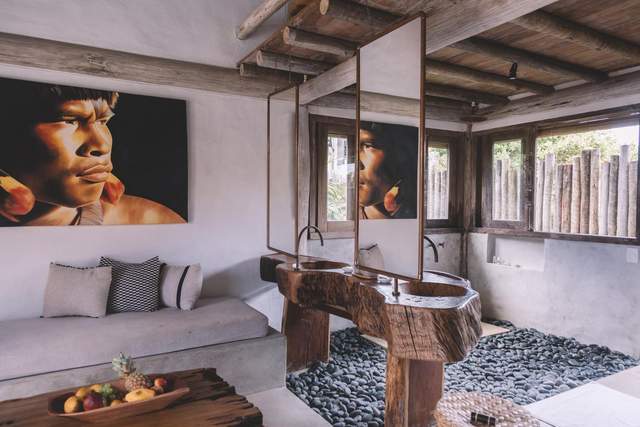 Розташований у невеликому селі між океаном та річкою, будинок зведений за класичними уявленнями бразильської архітектури з м'яким дахом та білими стінами. Всередині меблі зроблені з грубого неотесаного дерева, стіни прикрашені плакатами, а підлога зроблена з полірованого бетону.