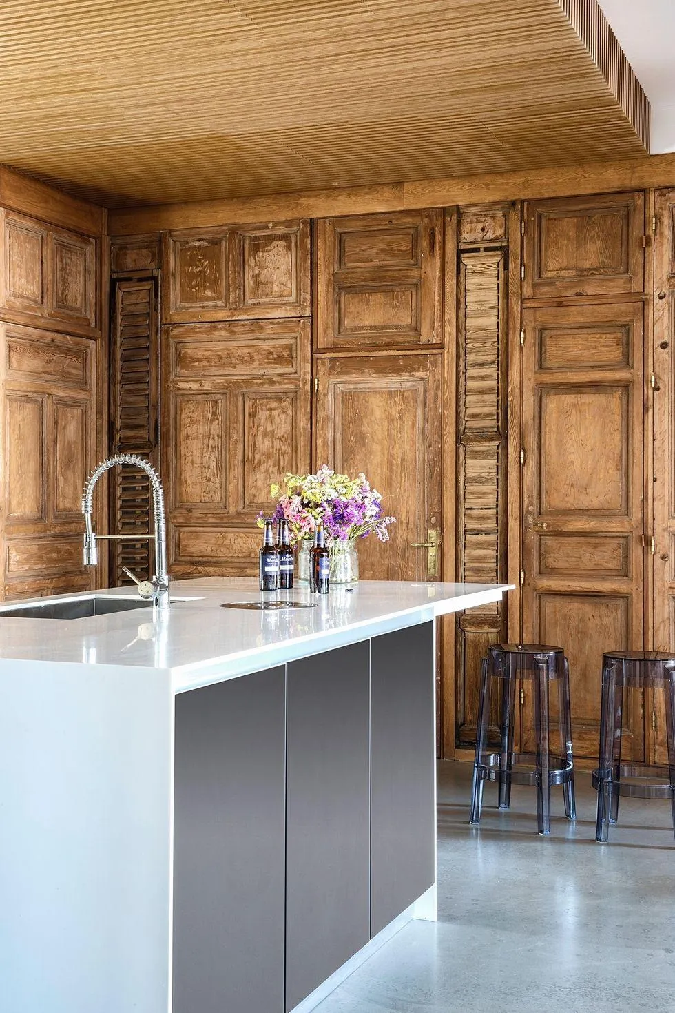 Для того, щоб додати у сучасний стиль сільську нотку, прикрасьте простір кухні старими, декорованими дверима. Чудовим поєднанням стануть базові шафи з фасадом від підлоги до стелі зі старими дерев’яними дверима та бахромою.