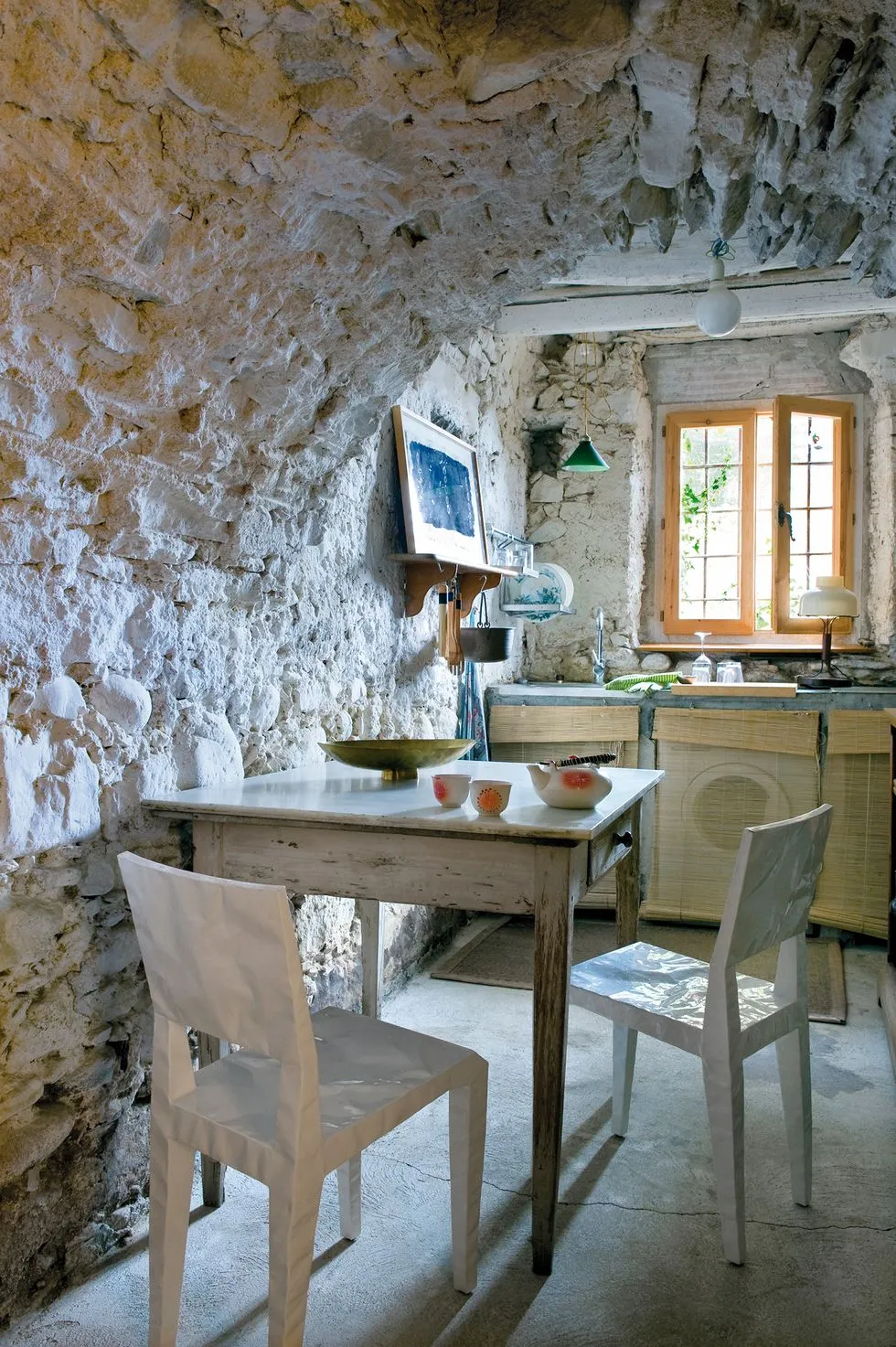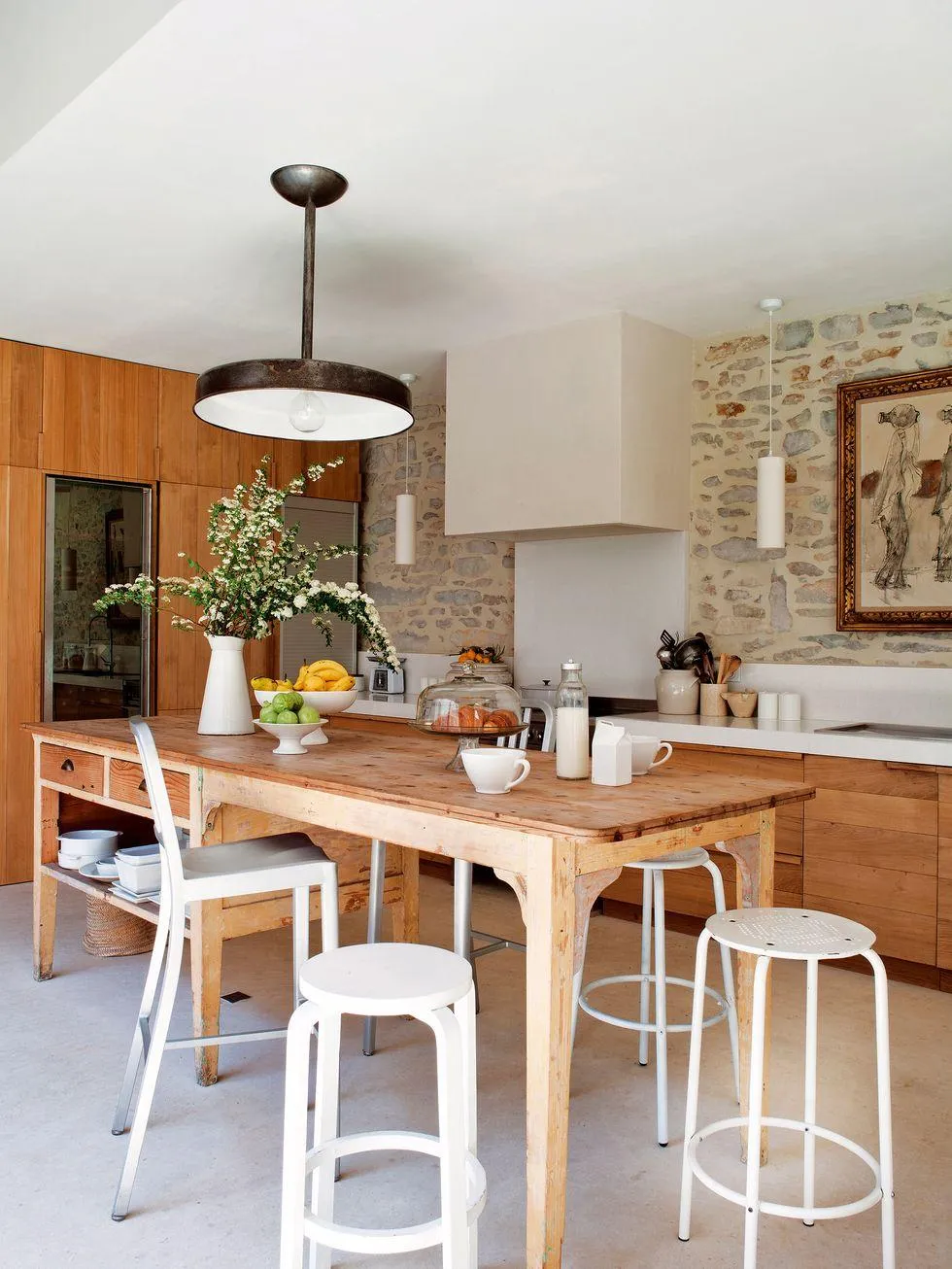 Щоб об’єднати антикваріат із сучасним дизайном та зменшити присутність каменю на стінах, варто використати білий колір. Наприклад, у кухні фермерського будинку в Ампурдані стіни та стелю побілили у білий колір для того, щоб простір чудово взаємодіяв зі старовинним столом, якому понад 100 років.