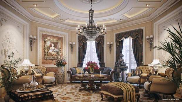 Стиль Ампір в інтер'єрі, при оформленні стелі оформлюється ліпниною або фресками.