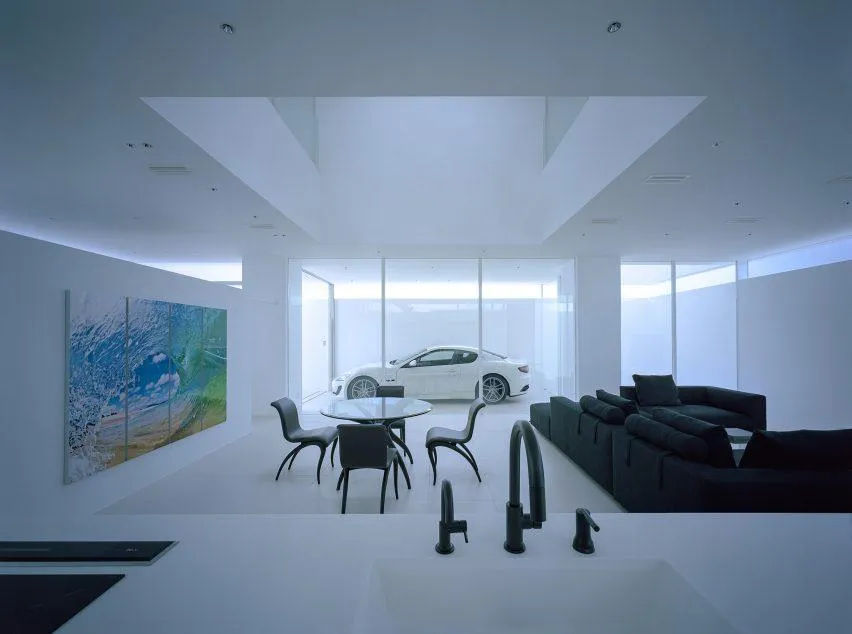 Як і зовнішній вигляд будинку, внутрішня обробка є білою та мінімалістичною для збереження фокусу на автомобілі, який стоїть у вбудованому гаражі. Двері зроблені із скла.