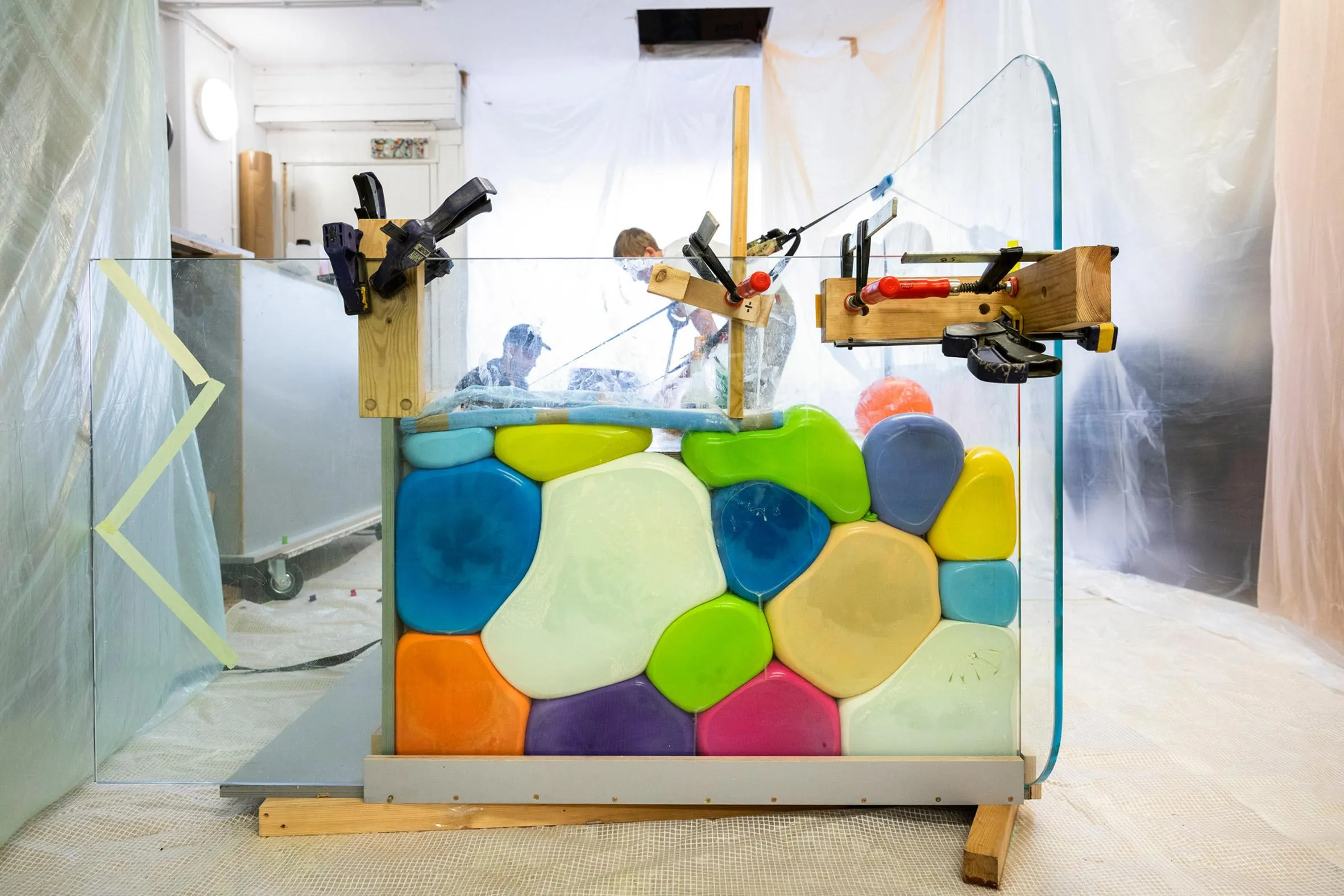 Для виготовлення такого прилавка, спочатку представники компанії створили металеву основу, яку обнесли склом. Тоді, наповнені рідиною кульки, творці встановлювали між склом та прилавком. Пізніше кульки застигали і їх приклеювали до основи.