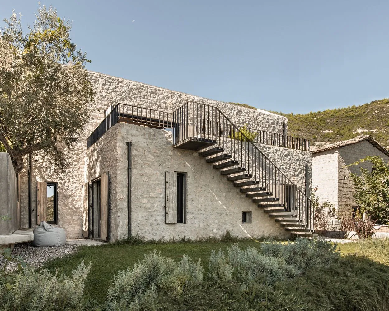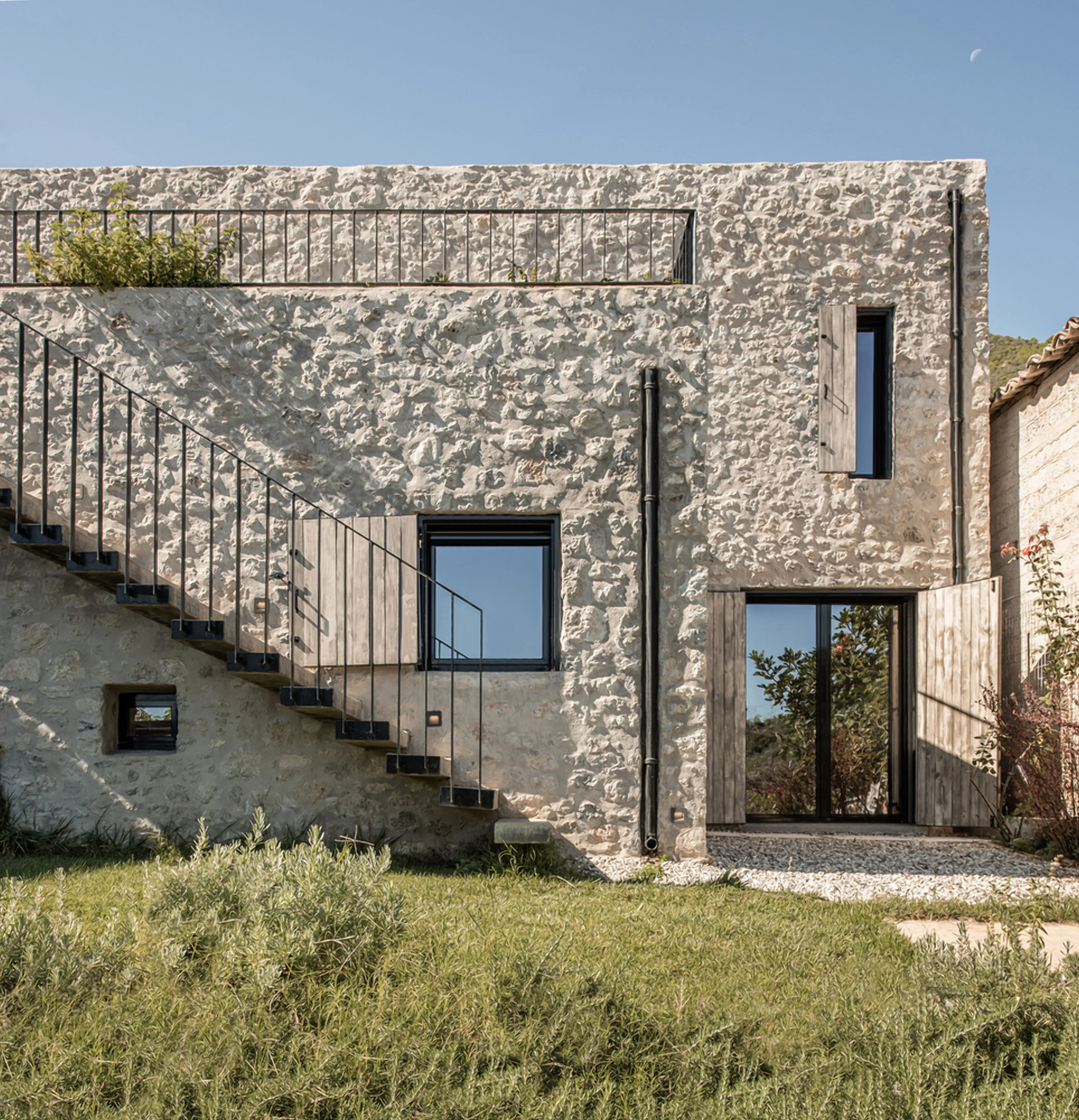 Ділянка, яка розташована на схилі з перепадом висоти 6 метрів від вершини до низу, привела до рішення створити будинок зі скромним, кам’яним фасадом. Дім непомітно вписується в околиці.