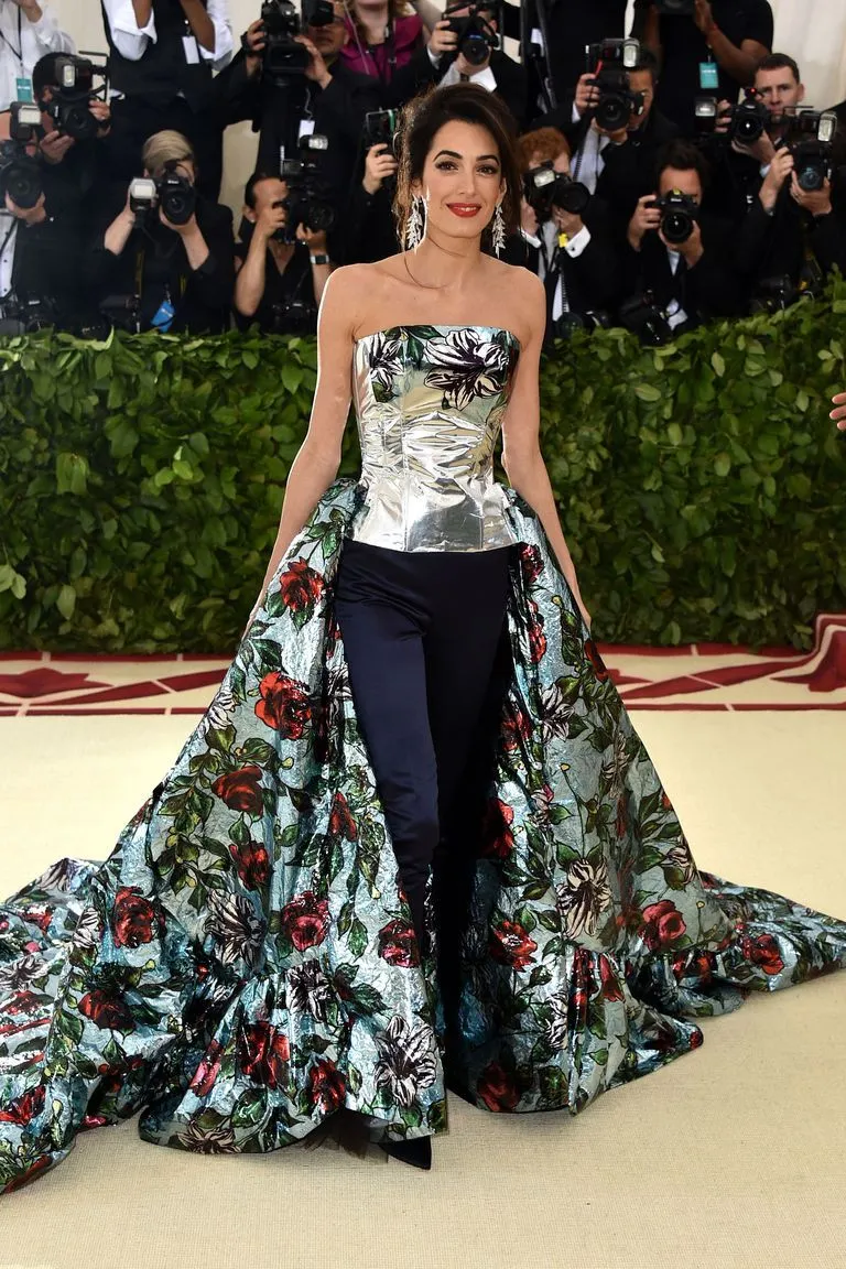 Амаль Клуні стала однією з небагатьох, хто одягнув на захід не традиційну розкішну сукню, а штани. Її образ доповнював сріблястий корсет і спідниця з вітражними квітами, яка кріпилась до поясу штанів.