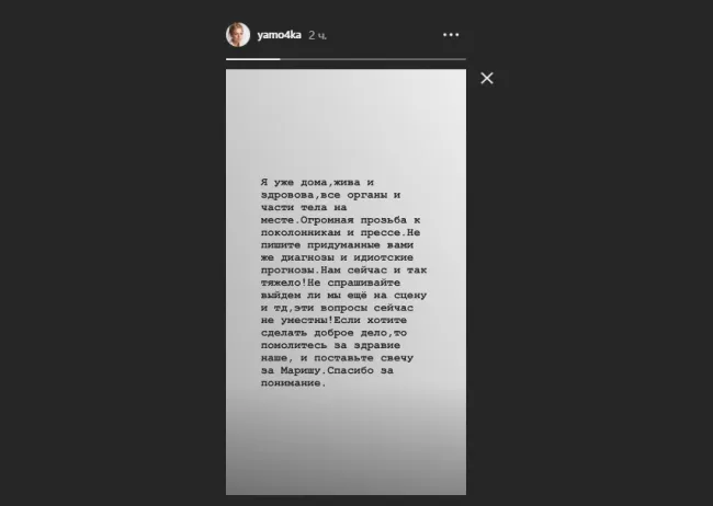 "Я вже вдома, жива і здорова, всі органи і частини тіла на місці. Величезне прохання до прихильників і преси: не пишіть вигадані вами ж діагнози і прогнози. Нам зараз і так важко! Не питайте чи вийдемо ми ще на сцену і таке інше – ці питання зараз недоречні! Якщо хочете зробити добру справу, то помоліться за наше здоров'я і поставте свічку за Марину. Дякую за розуміння", – написала Яна Глущенко.