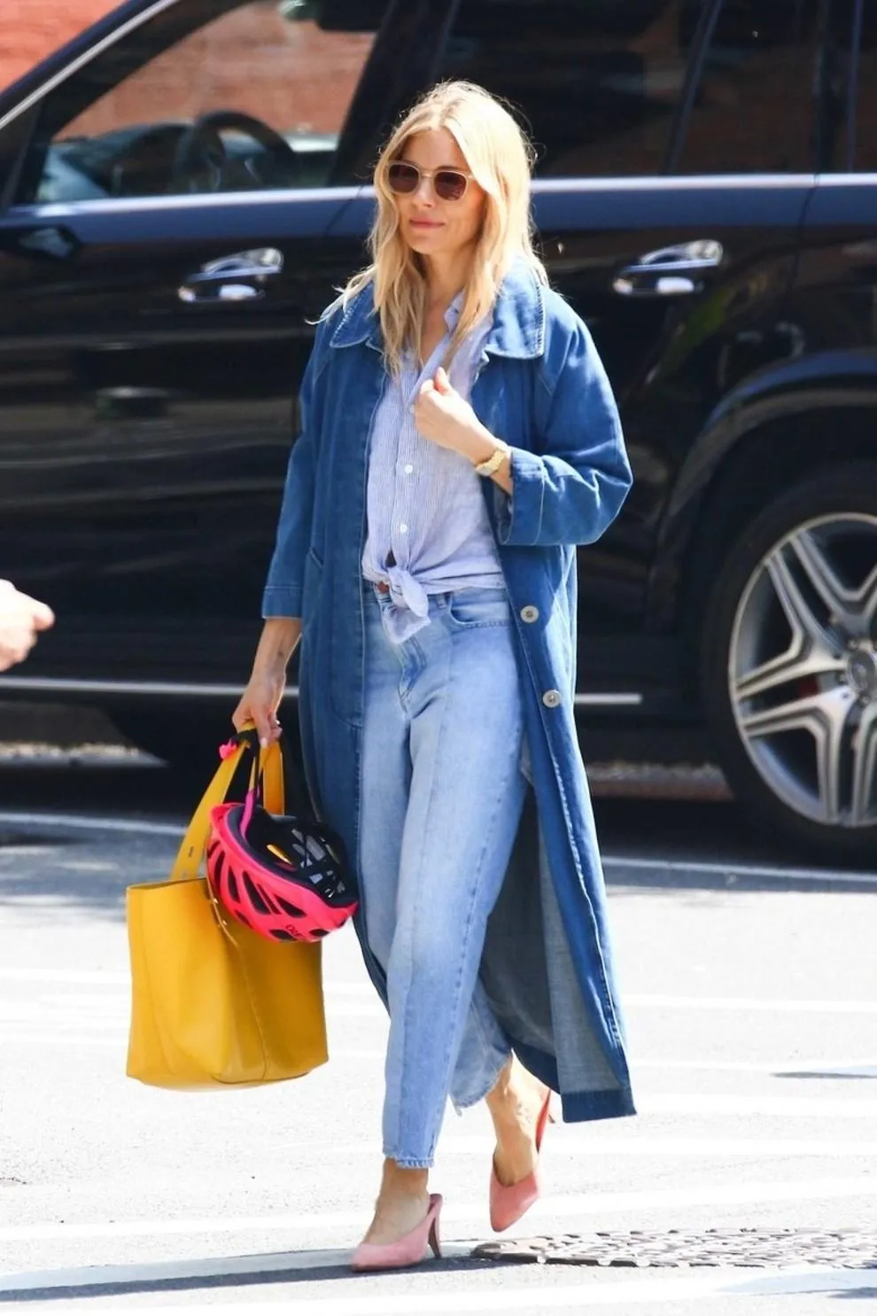 До прикладу, відома актриса і фотомодель Сієнна Міллер, яка для вуличної зйомки одягла блакитні джинси з тренчем з деніму, бавовняну блакитну сорочку і рожеві мюлі. Сумку обрала яскраво-жовтого кольору.