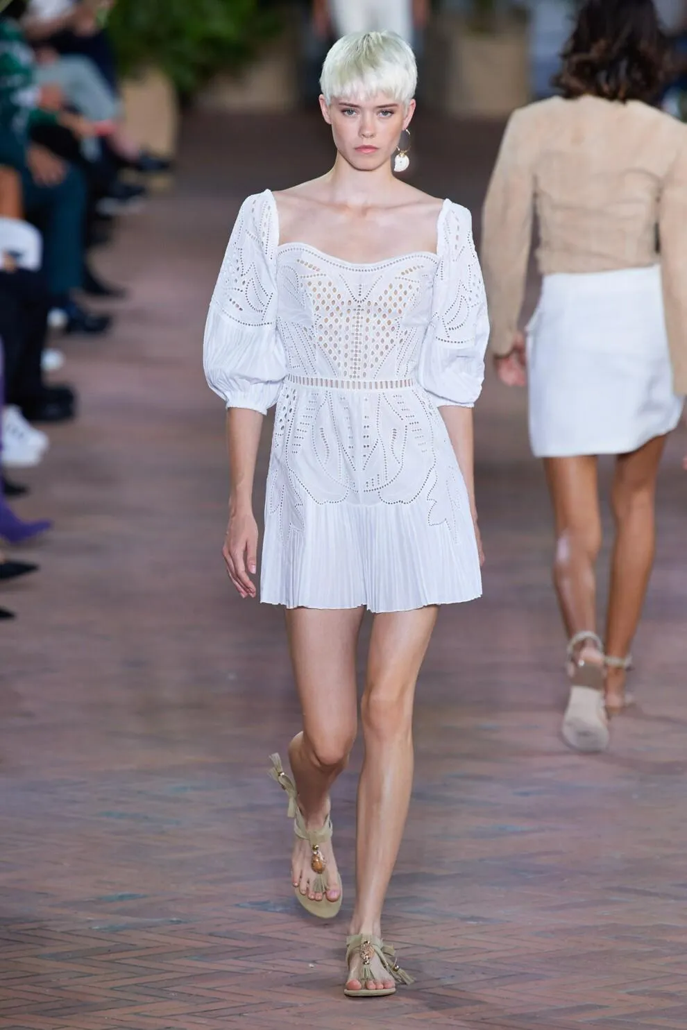 Alberta Ferretti продемонстрували мінісукню з нюдового шовку в парі із сандалями-гладіаторами, Christian Dior показали максівбрання з напівпрозорої тканини.