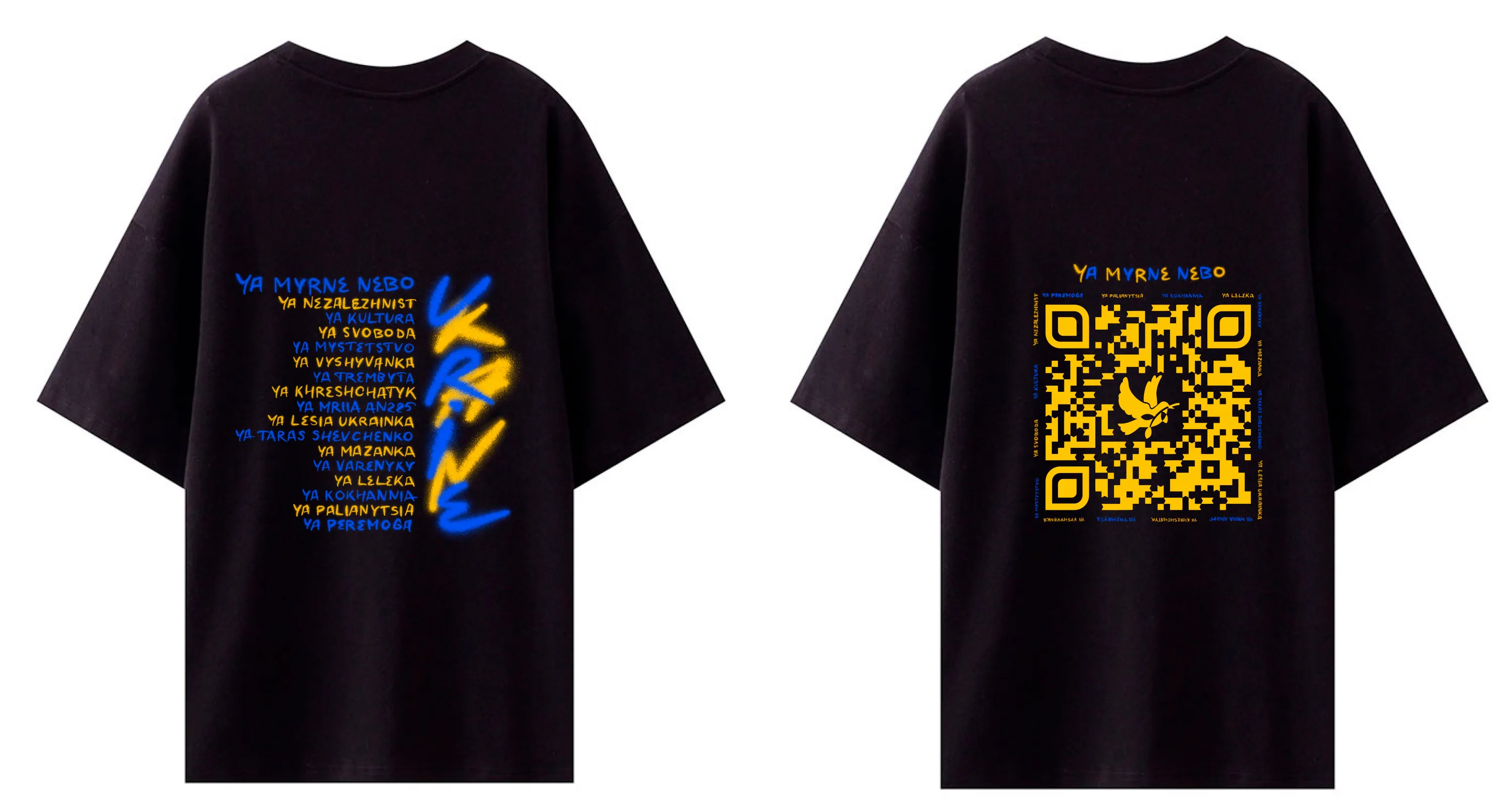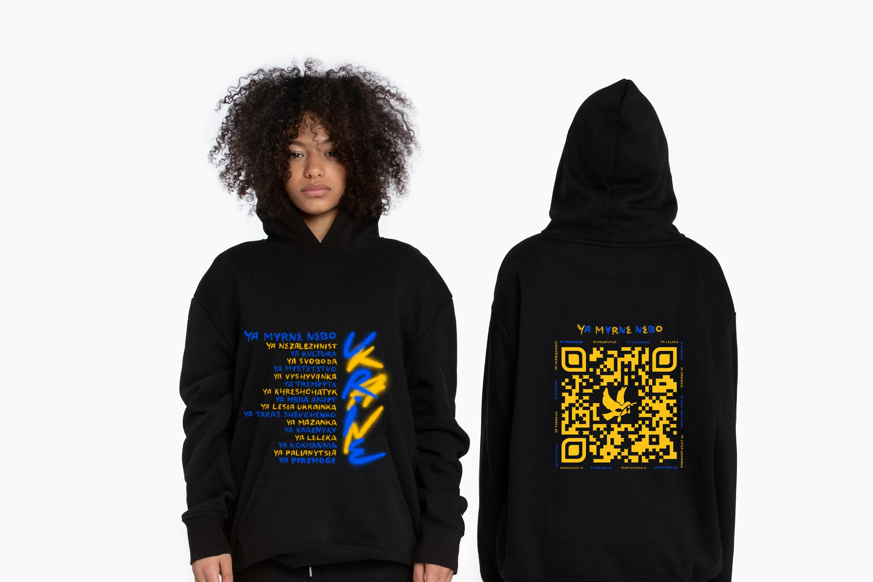 Кожен охочий може придбати чорне худі або футболку з синьо-жовтим надписом "Україна" та патріотичними словами: "Я незалежність", "Я свобода", "Я вишиванка", "Я Хрещатик", "Я Леся Українка", "Я мазанка", "Я лелека", "Я паляниця".