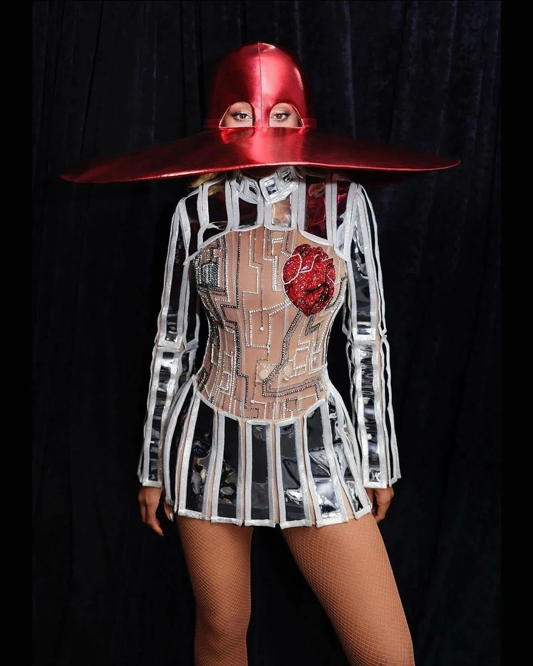 Образ зірки доповнювали тілесні колготки в сіточку та об’ємний червоний капелюх з прорізами для очей, який спадав на обличчя.