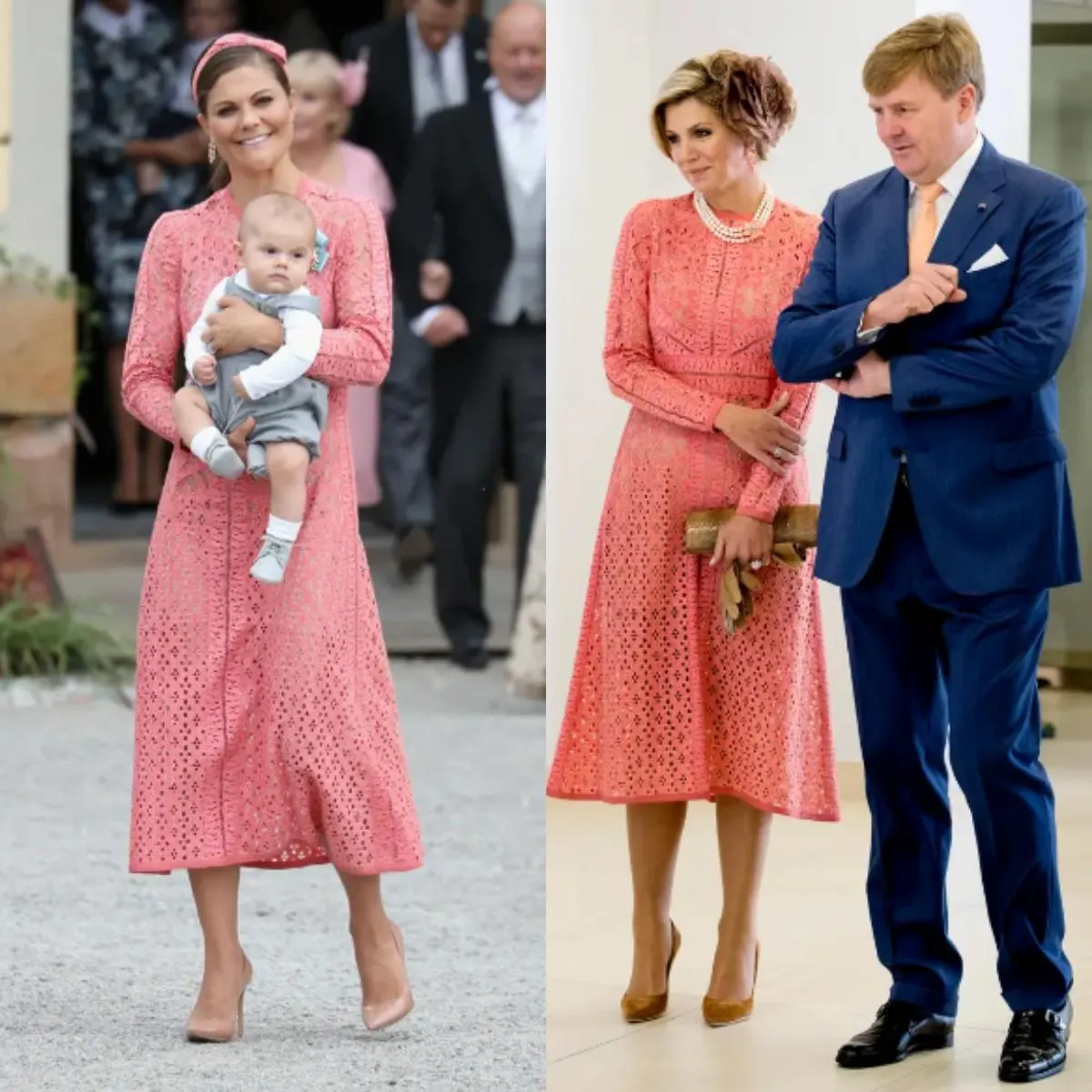 Кронпринцеса Швеції Вікторія на хрестини принца Швеції Олександра одягнула персикову сукню Ellie Saab. Згодом в аналогічному платті під час поїздки до Португалії з’явилася королева Нідерландів Максима.