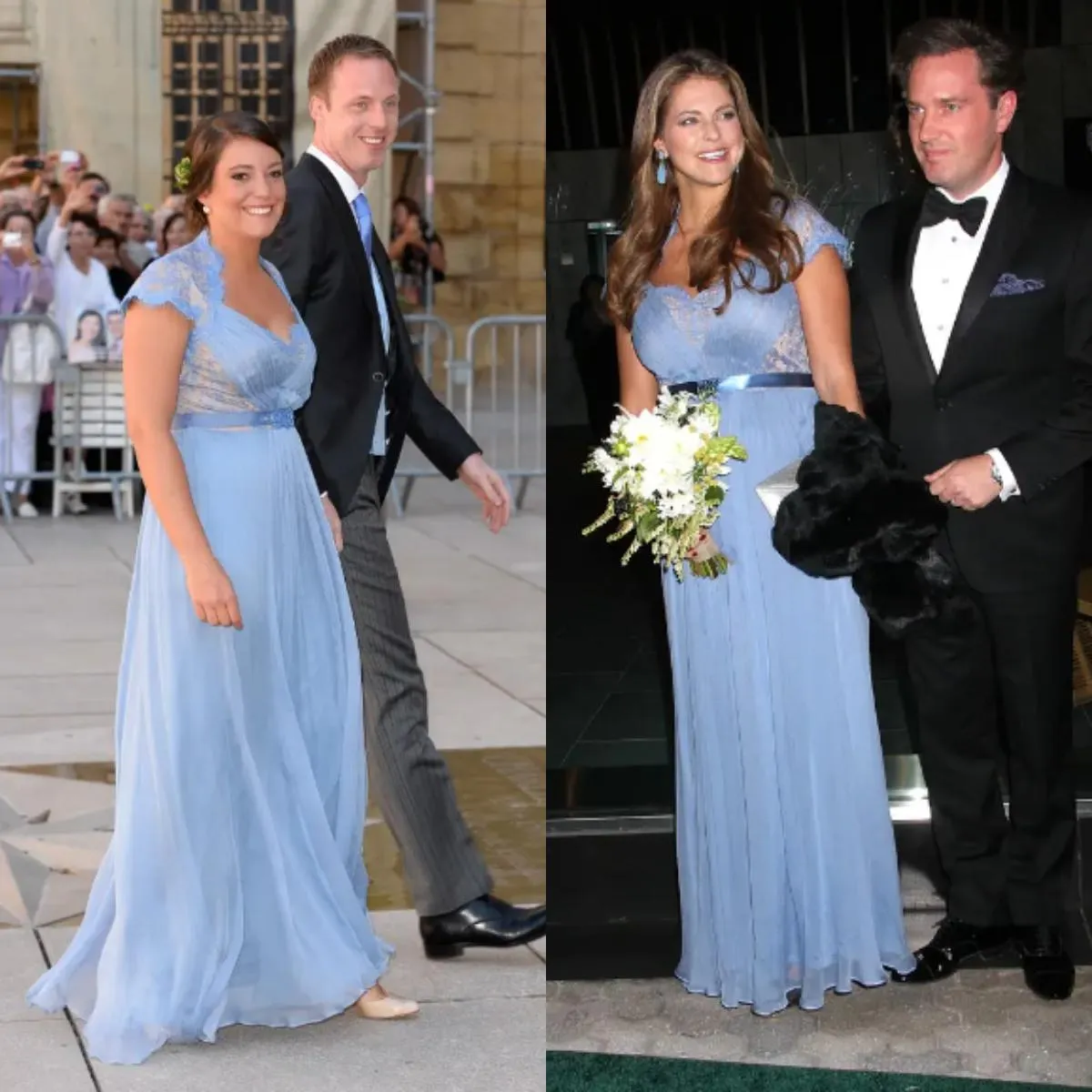 Принцеса Олександра Люксембурзька була у блакитній сукні Jenny Packham на королівському весіллі у вересні 2013 року. Через місяць шведська принцеса Мадлен одягла таку ж сукню під час візиту до Нью-Йорка.